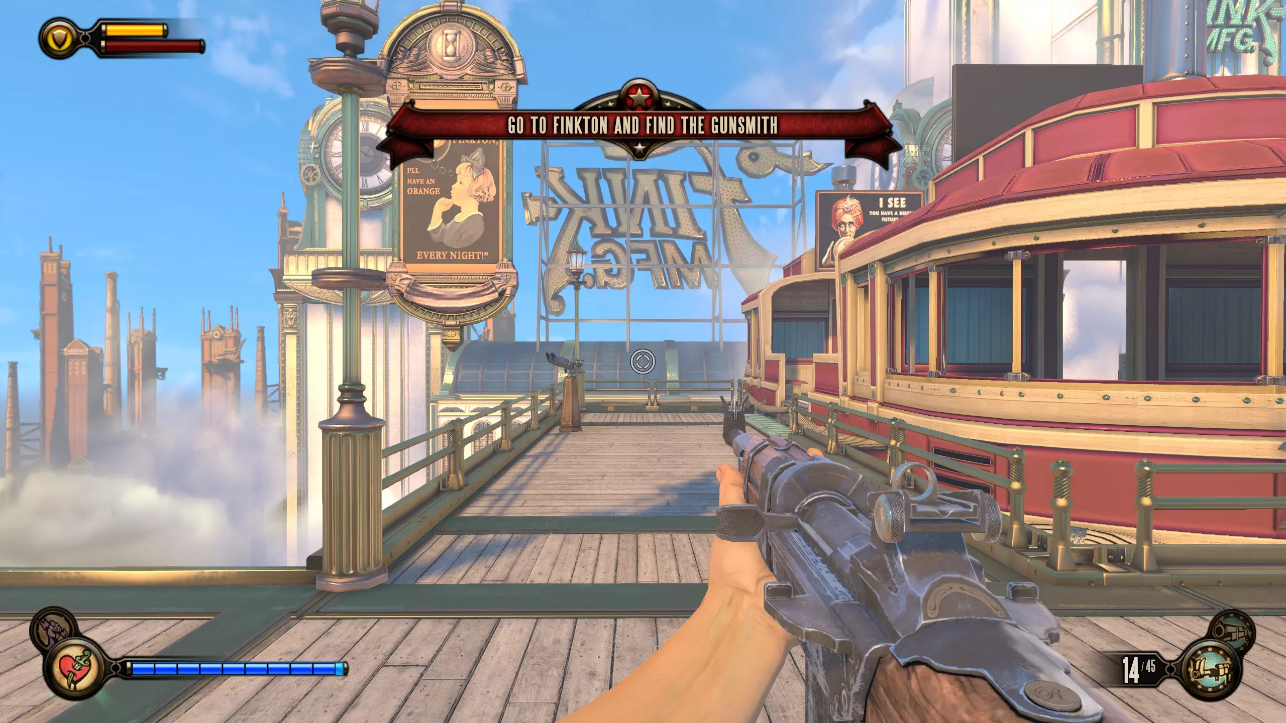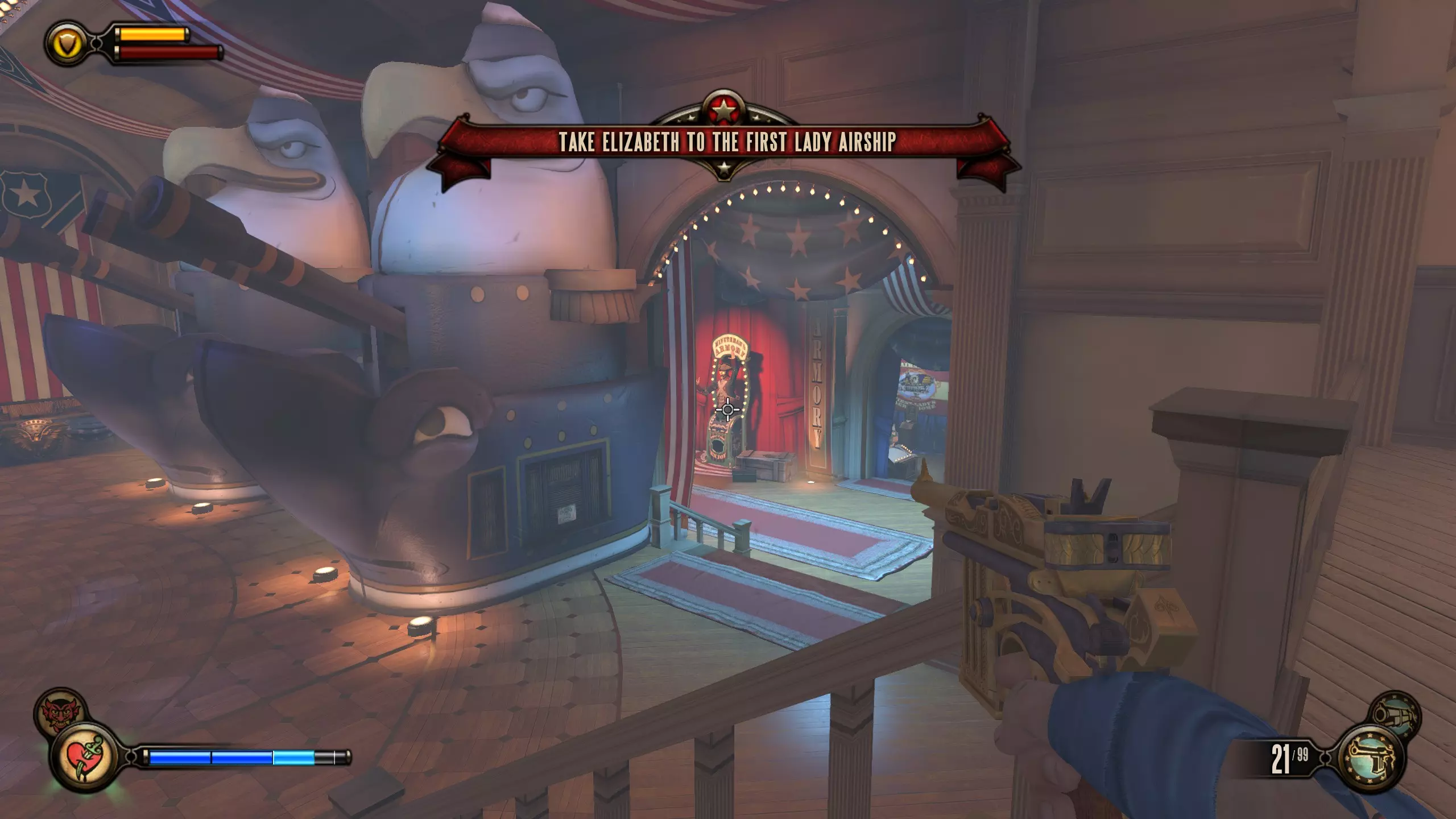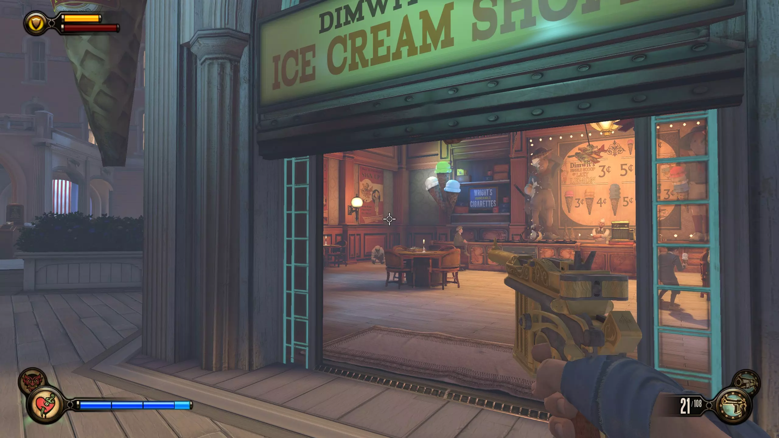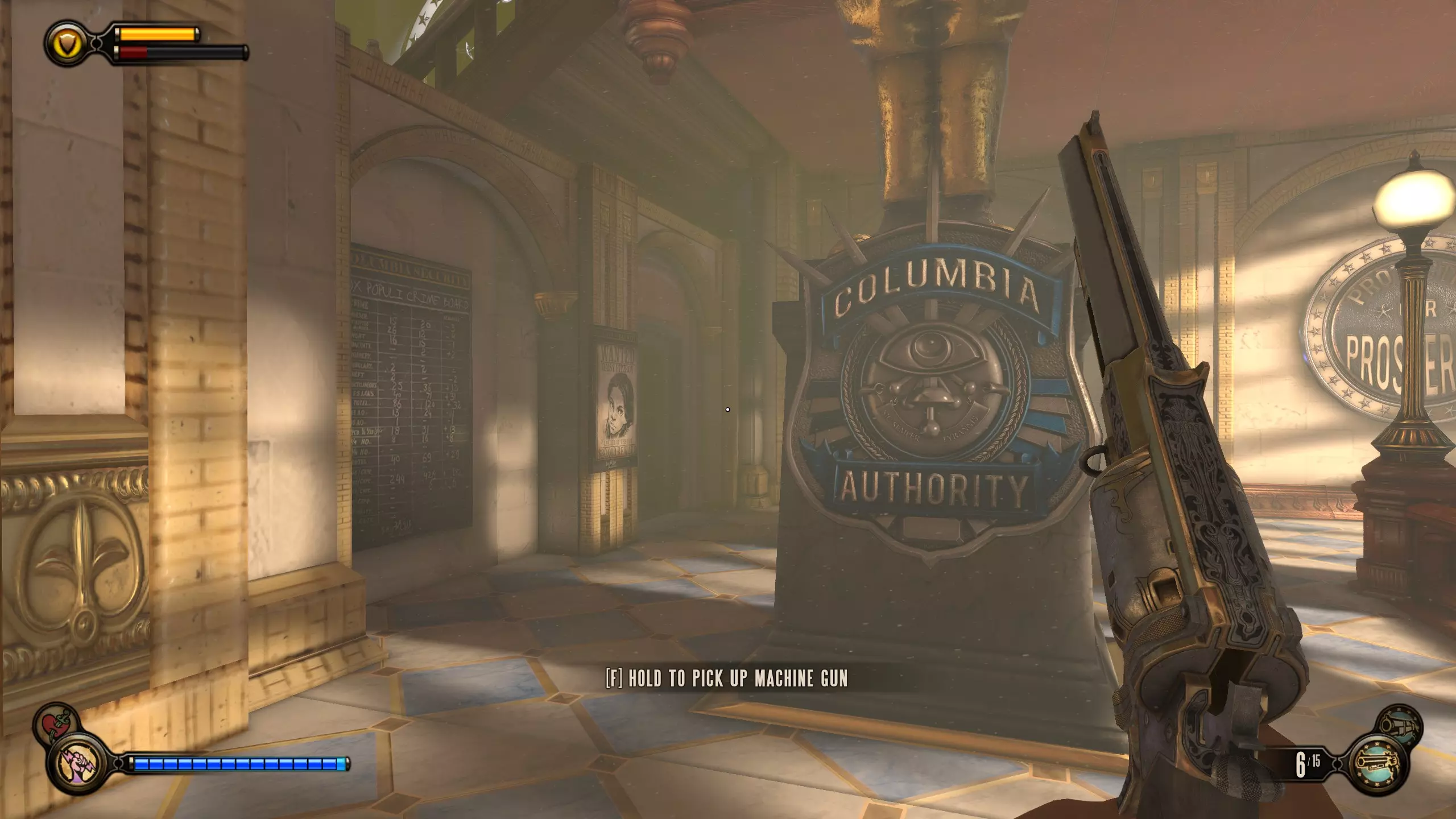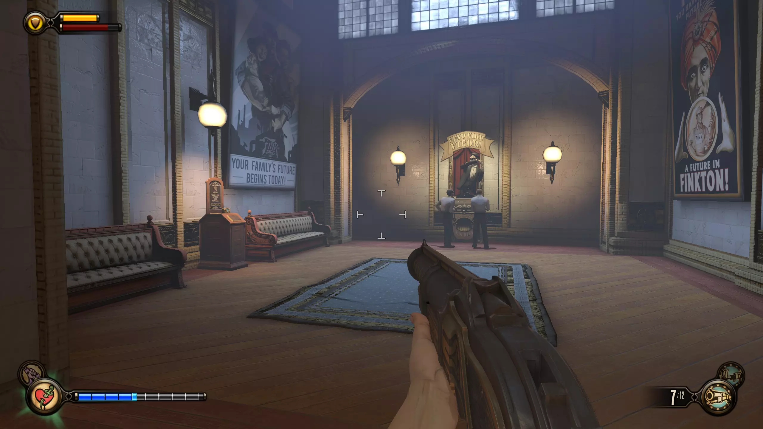 康姆斯托克中心屋顶 活动电影放映机4-6号和灌注1号 走进蓝带酒吧后,你面前会有三台活动电影放映机。与卢特斯双胞胎交谈可获得你的第一个灌注。