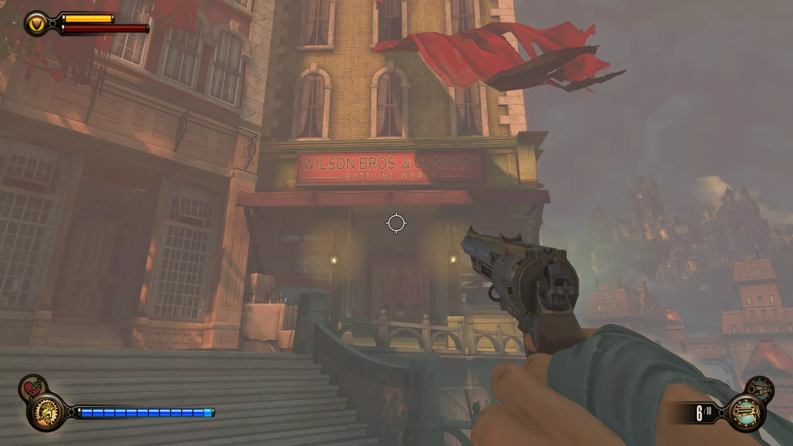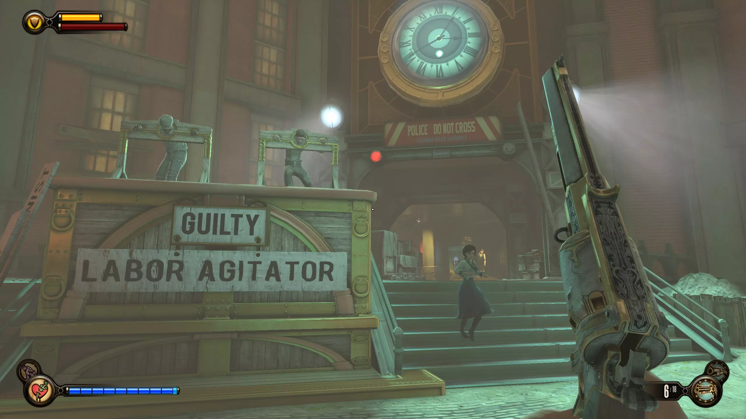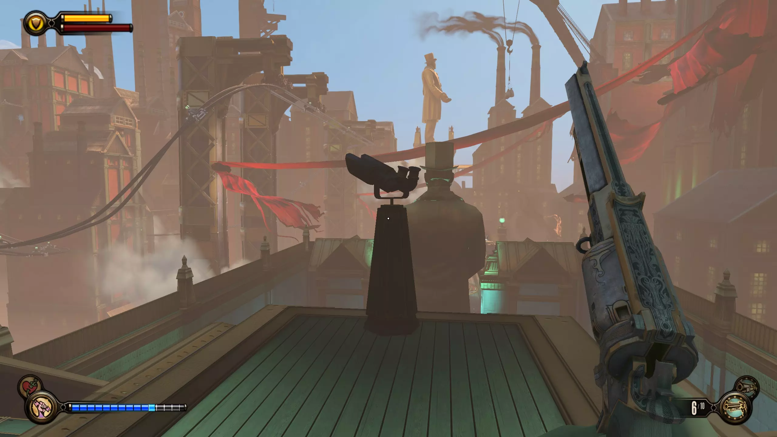 望远镜#6 在贫民窟区域前进,直到看到“有罪劳工煽动者”标识。走到时钟下方,向左上方看。阳台处会有一个货运挂钩和望远镜。
