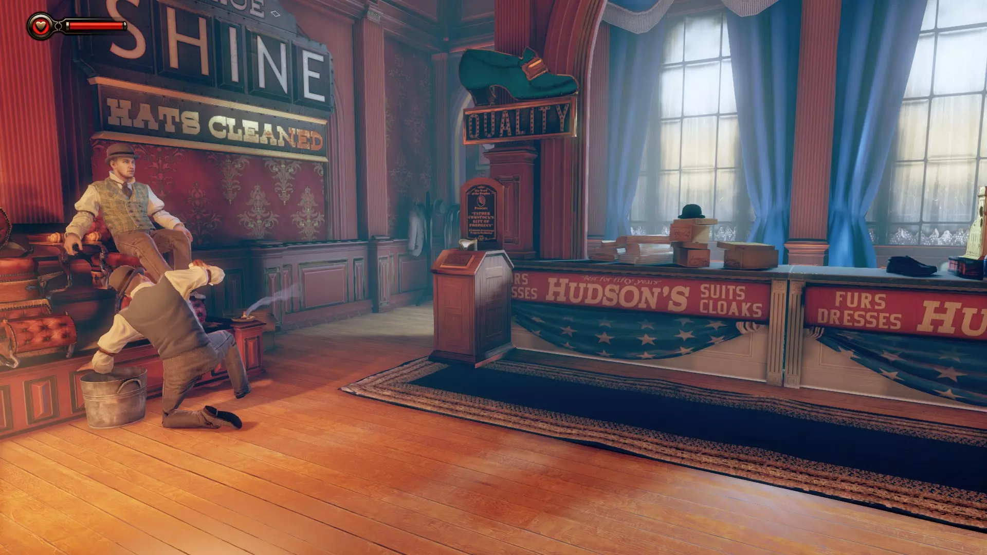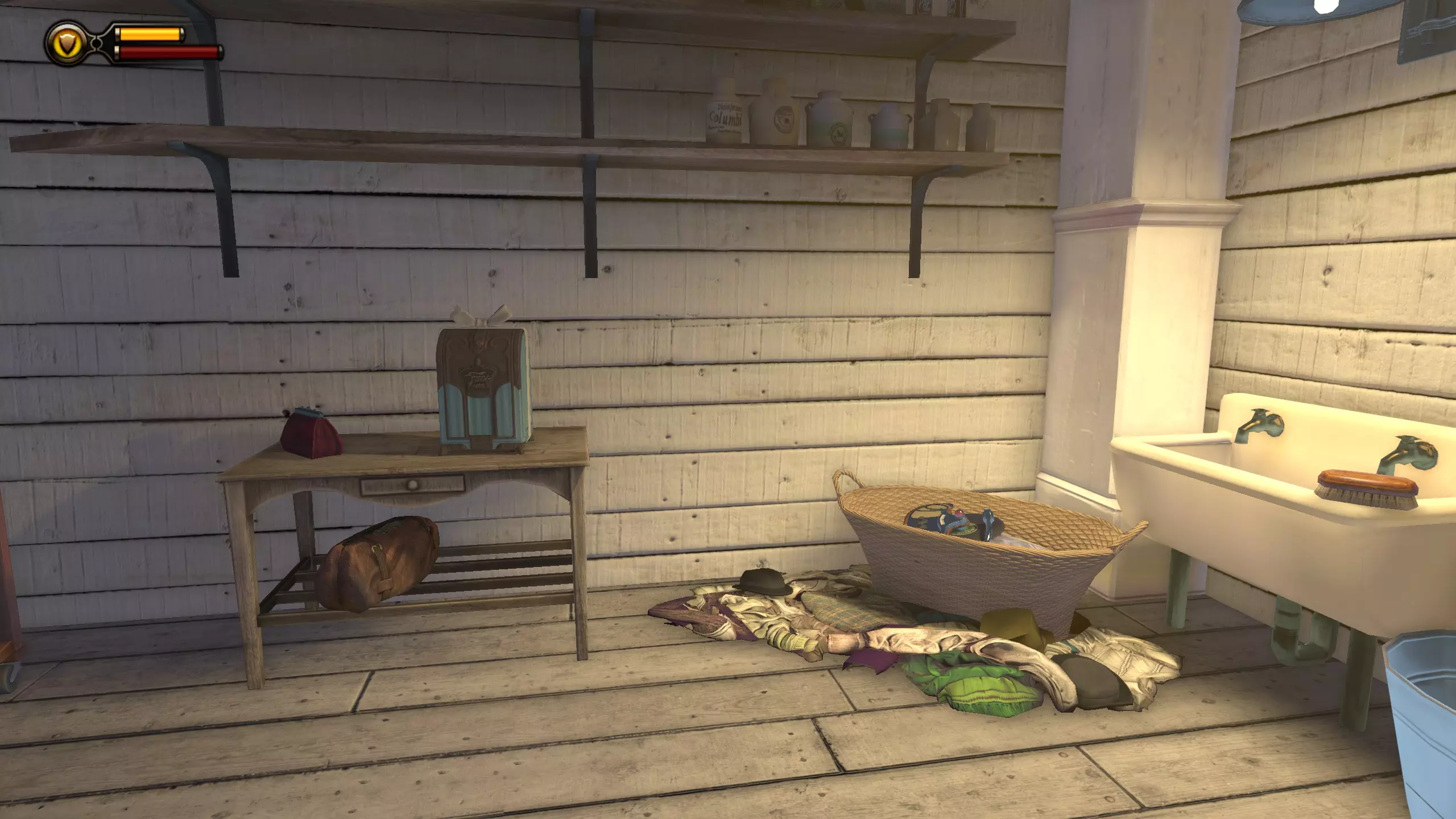 留声机28号和灌注瓶8号 在有留声机柜的同一栋建筑内,前往吧台右侧,进入墙上有血迹的第一个洗手间。如果你有密码本,伊丽莎白可以破译密码。进入下一个洗手间,衣架上会有一顶帽子。与帽子互动会打开秘密通道。通道内有灌注瓶和留声机。