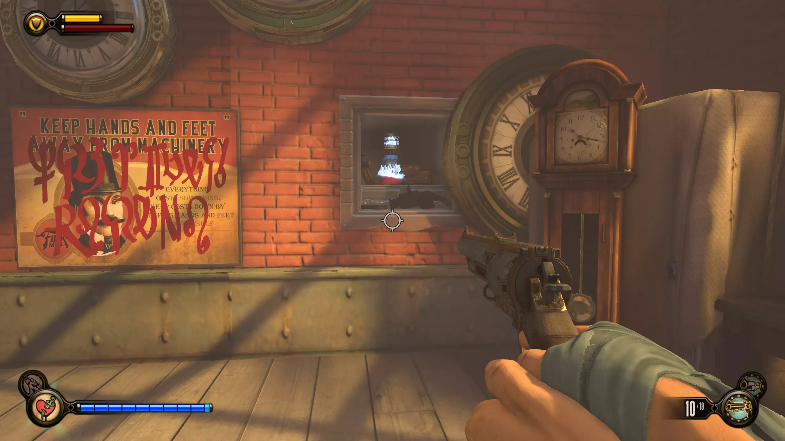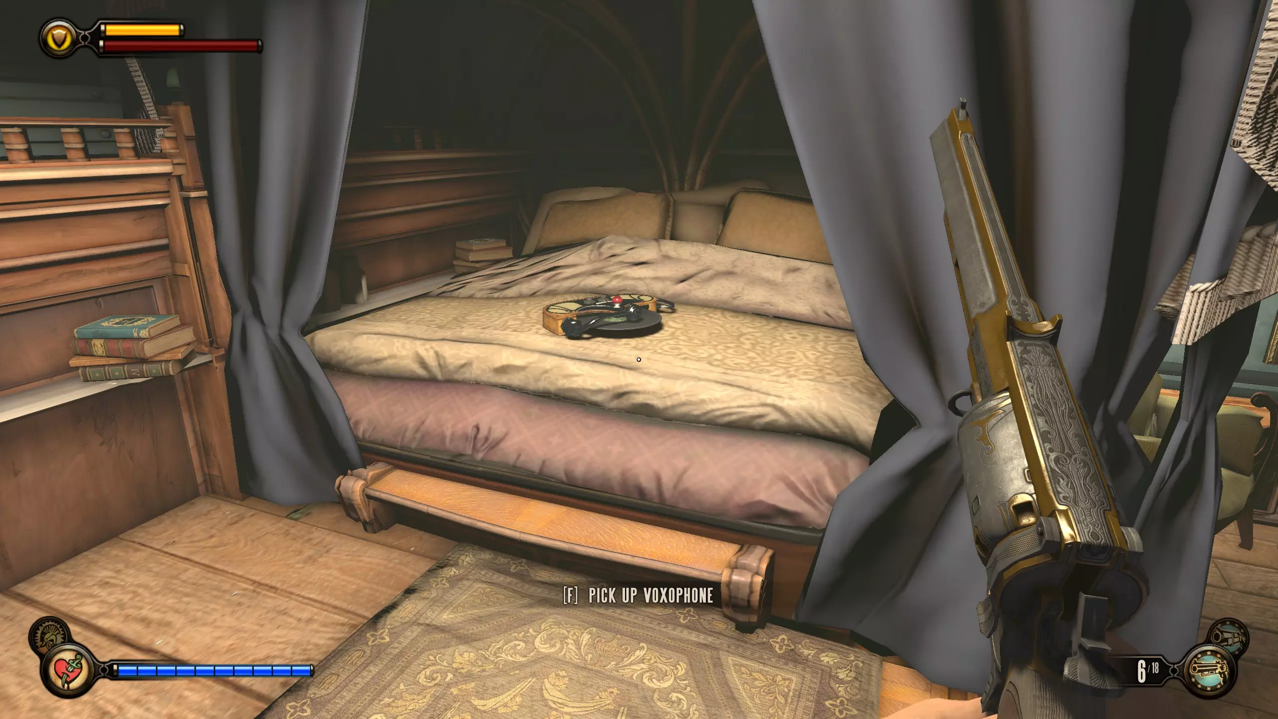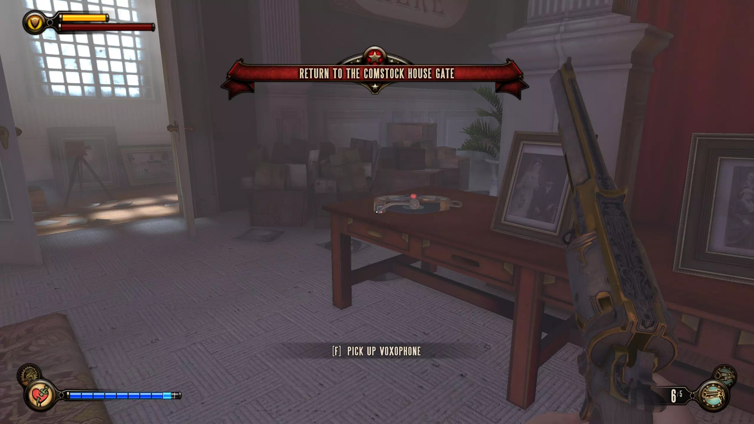 留声机#35 在伊丽莎白用火车裂隙阻挡你后,她会打开另一个裂隙,随后被抓走。向左转,会有一张桌子,上面放着一台留声机。