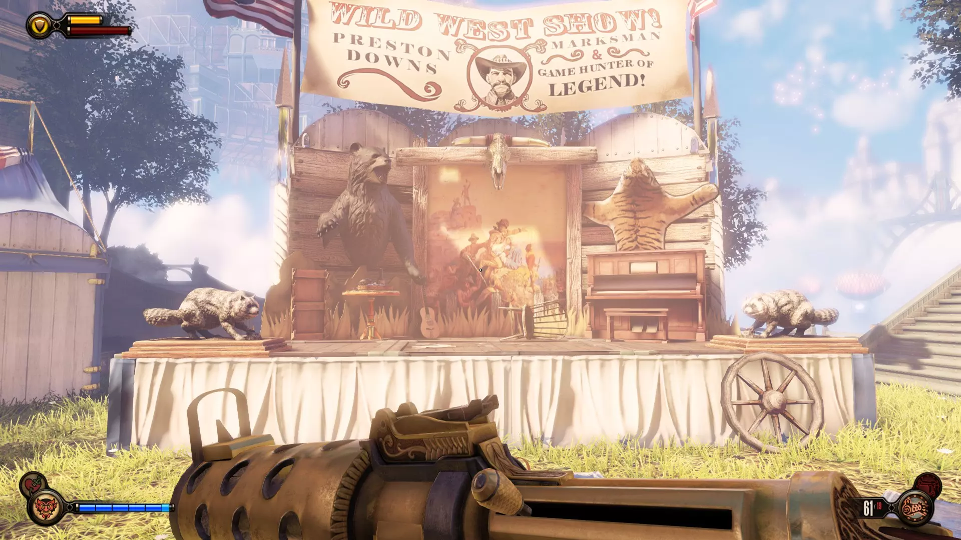 留声机#8 进入游戏提示“并非总是开枪才是最佳选择”的房屋后,前往室外,会看到一个有熊雕像的舞台。留声机就在舞台上。