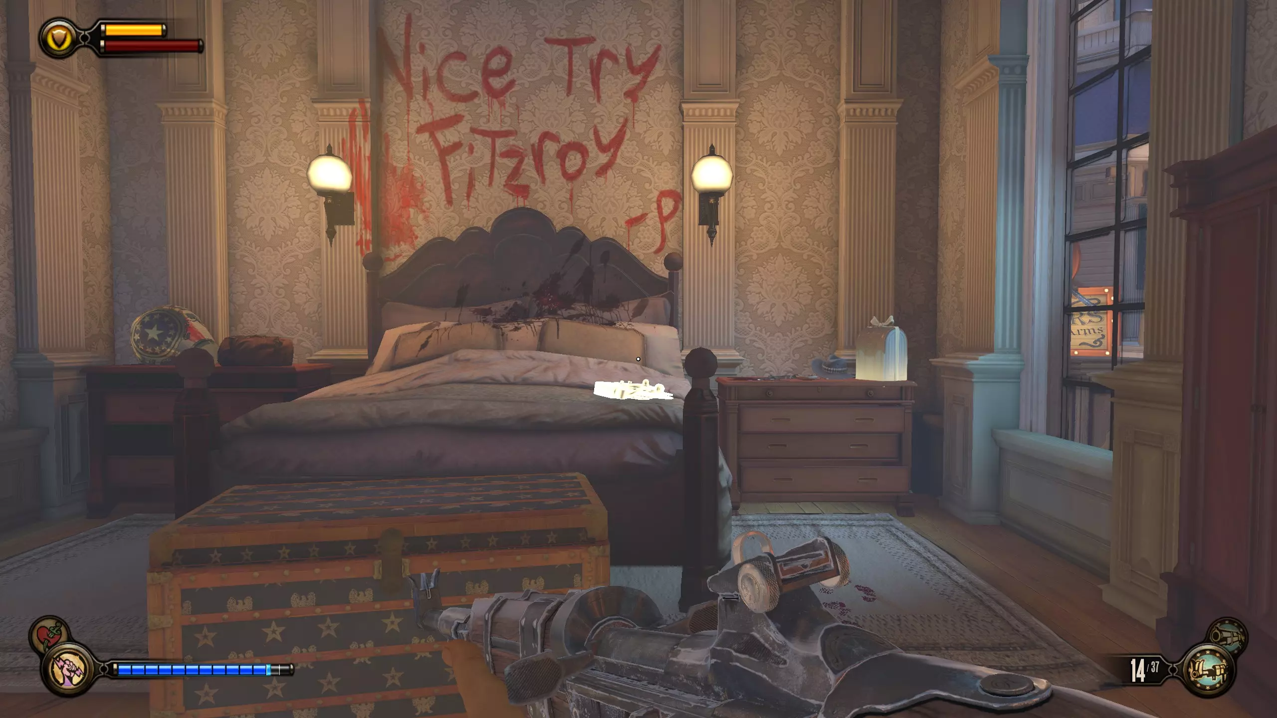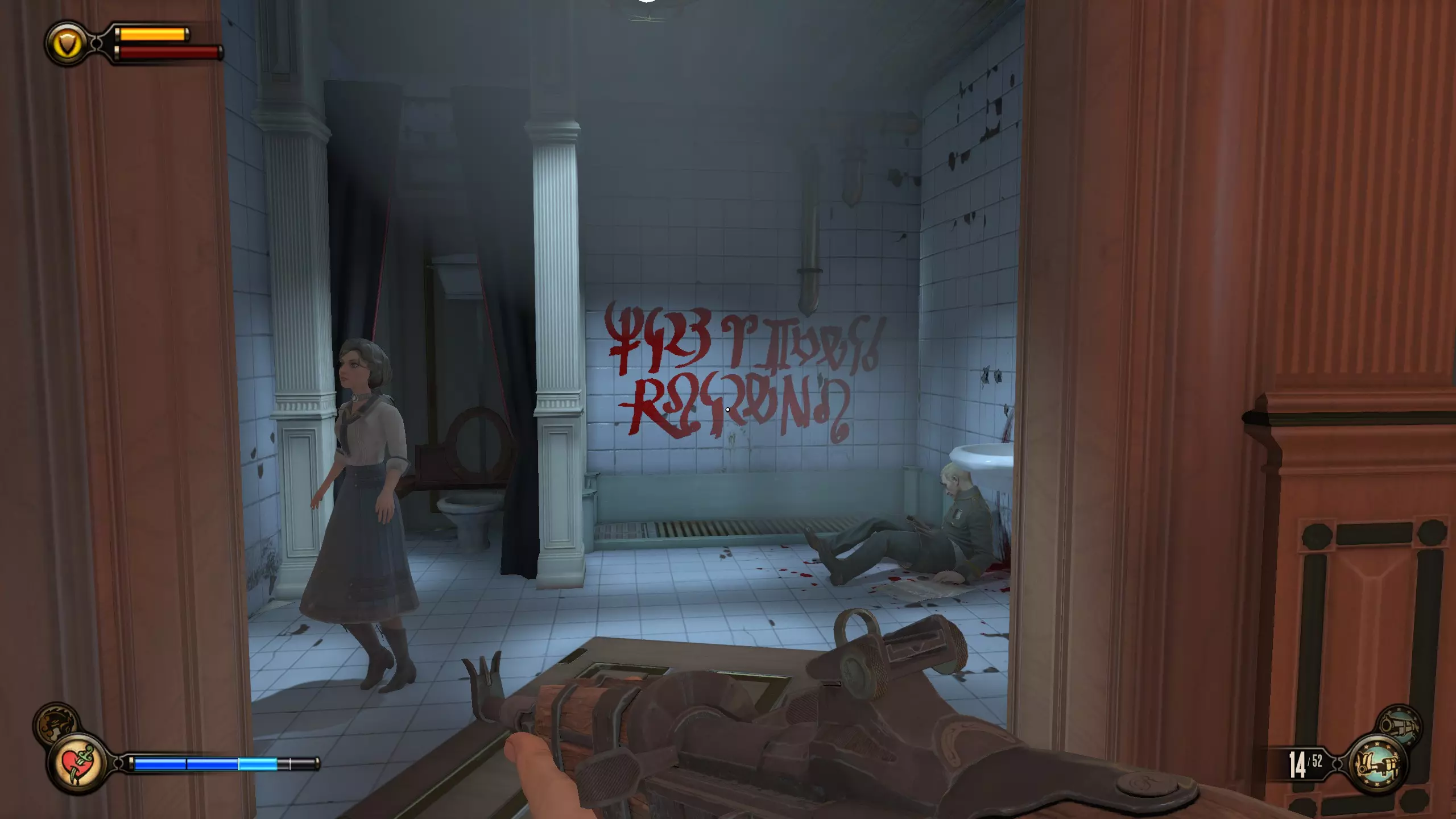 留声机#53 继续前进,直到看到一具尸体,其旁边窗户上有用红色字迹写的文字。地面上有一台留声机。