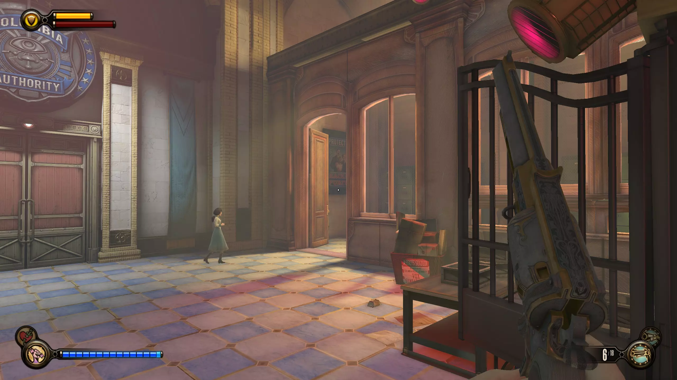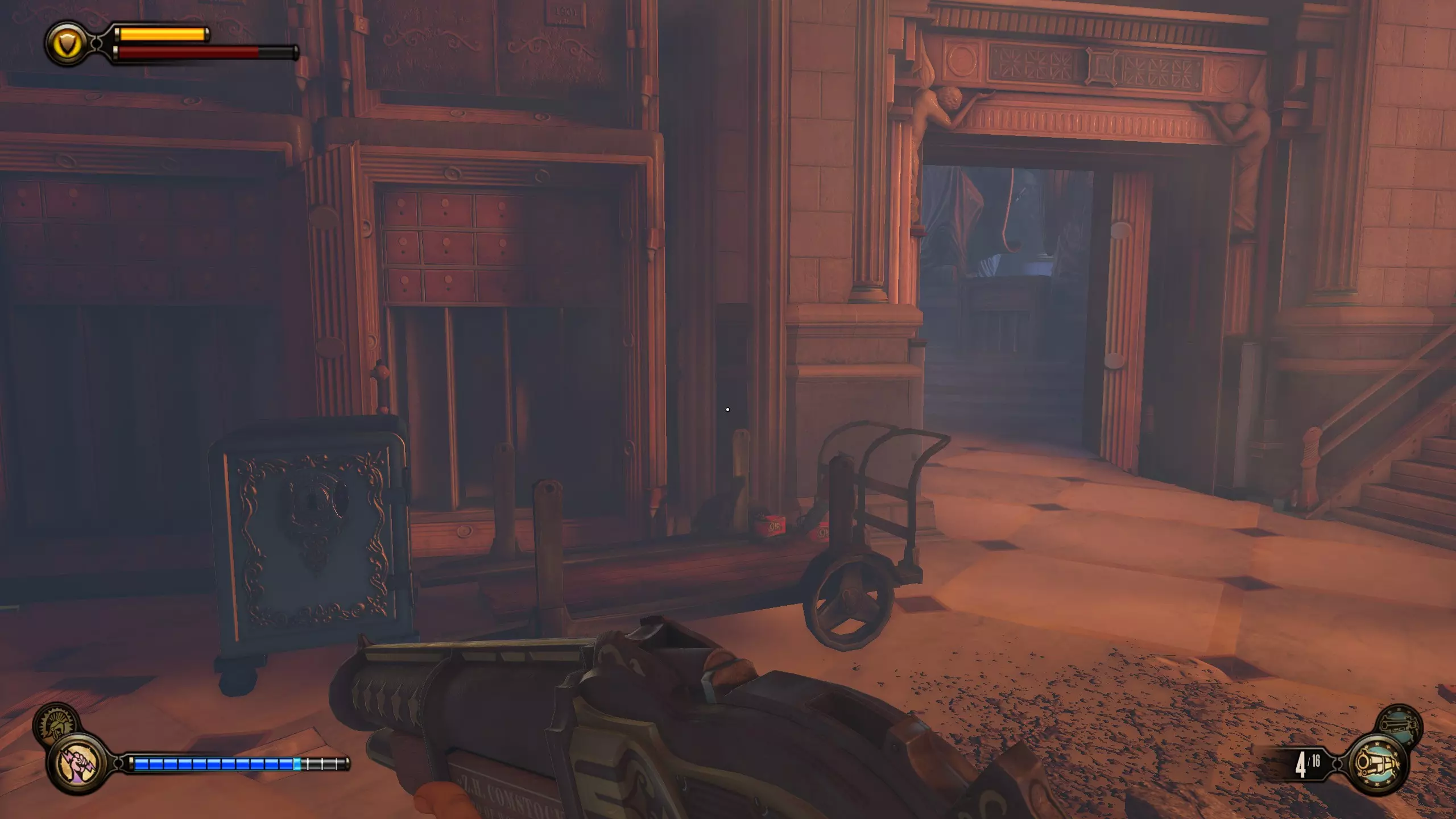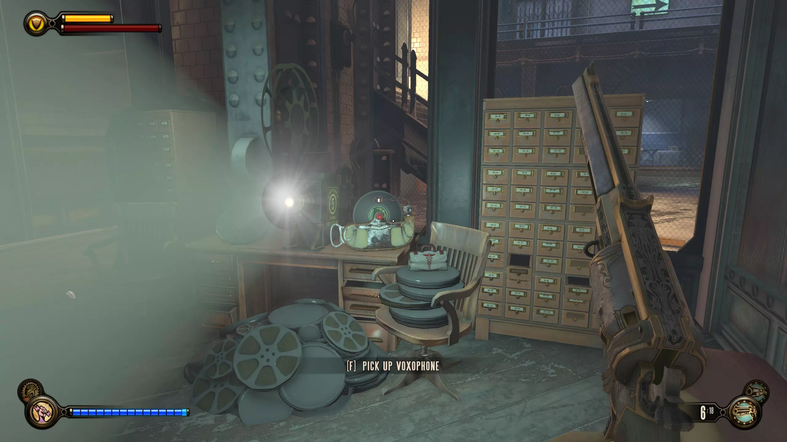 活动电影放映机1号和语音留声机2号 走过连接的桥梁后,你会来到一座大型雕像前。向右走,等待建筑与平台对齐。进入建筑后,活动电影放映机就在柜台前方。语音留声机则在柜台后方的保险箱旁边。