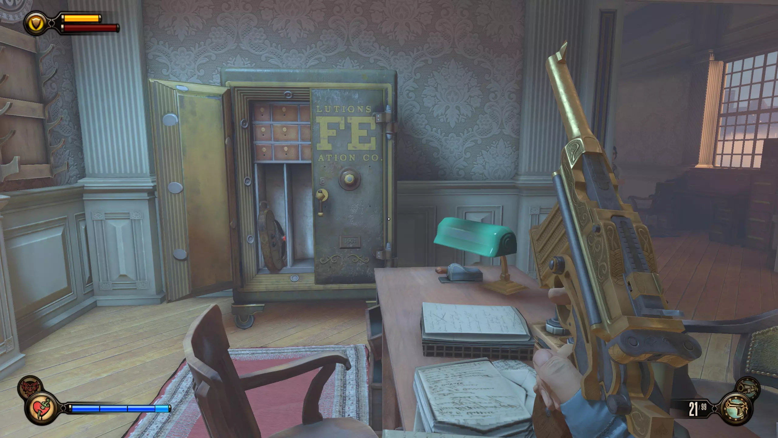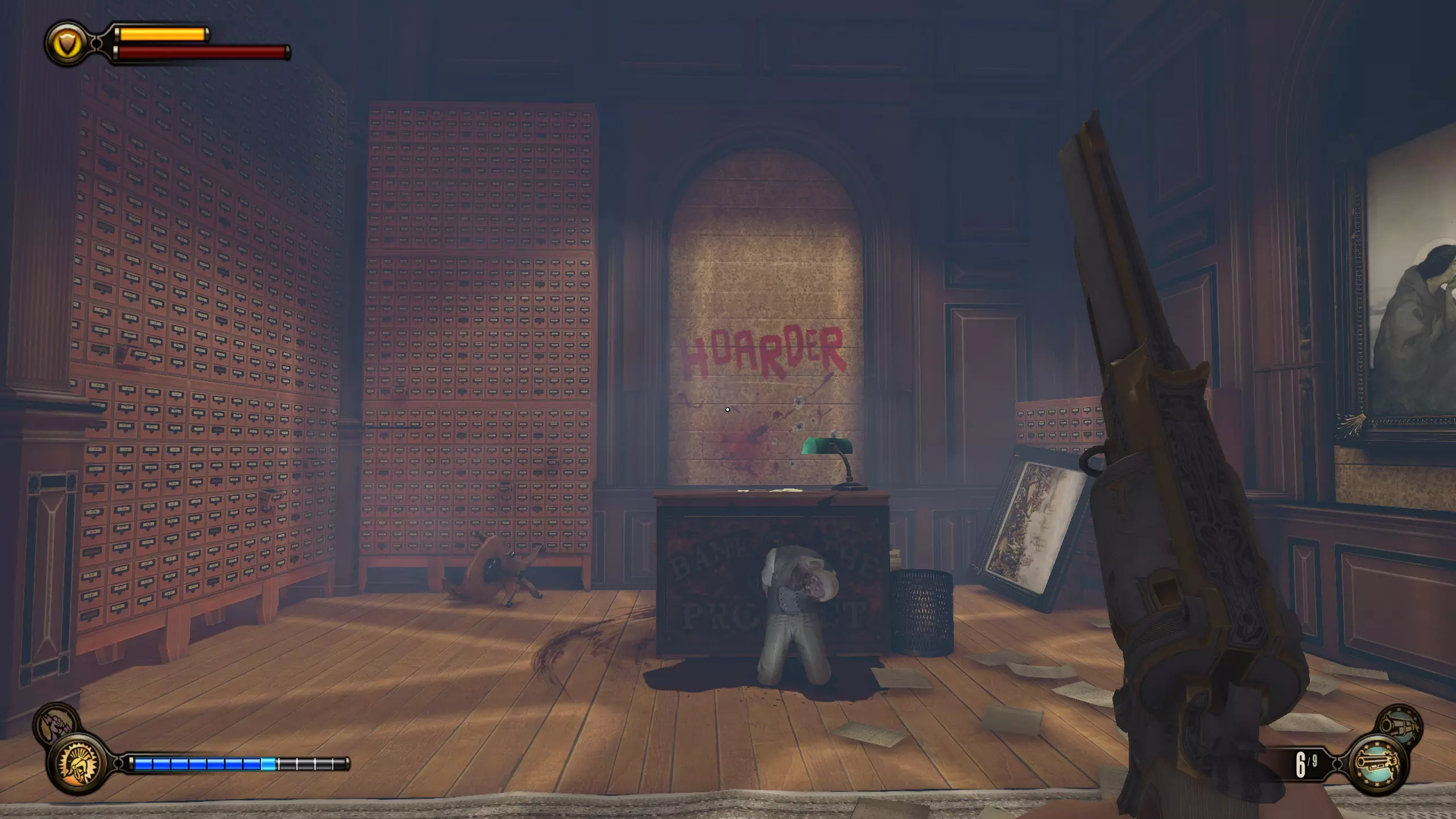灌注#23和录音器#66 在银行,在大型保险库门前左转。一直走到后面的房间,你会看到墙上写着“囤积者”。走近它,与打字机互动,然后你就能获得灌注和录音器。