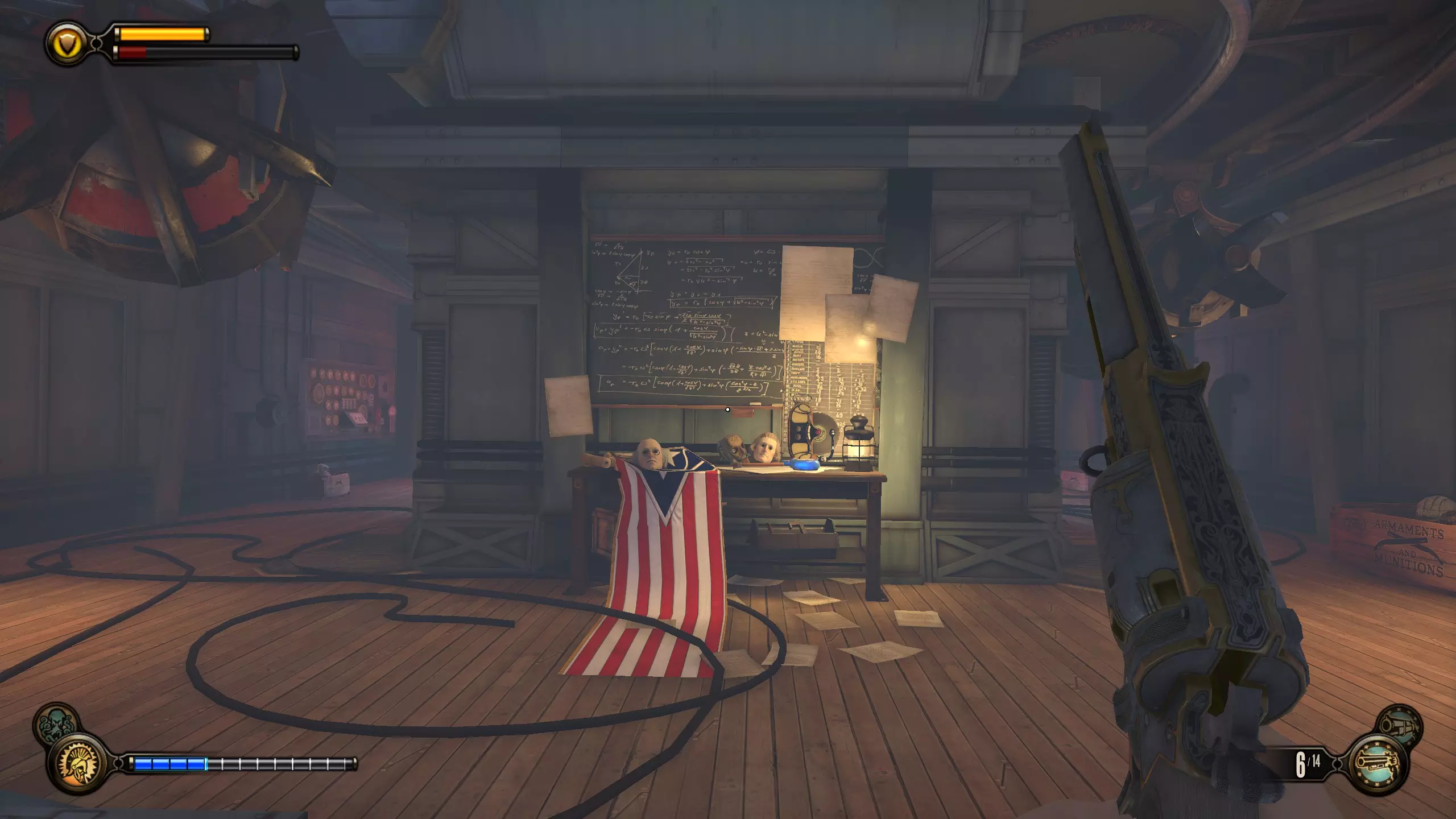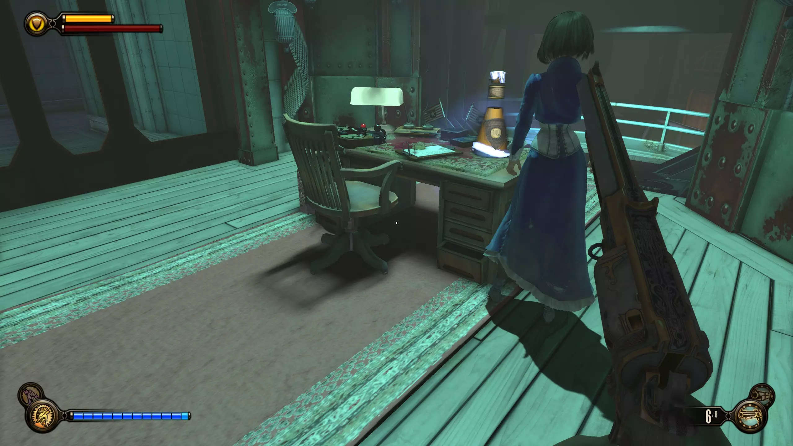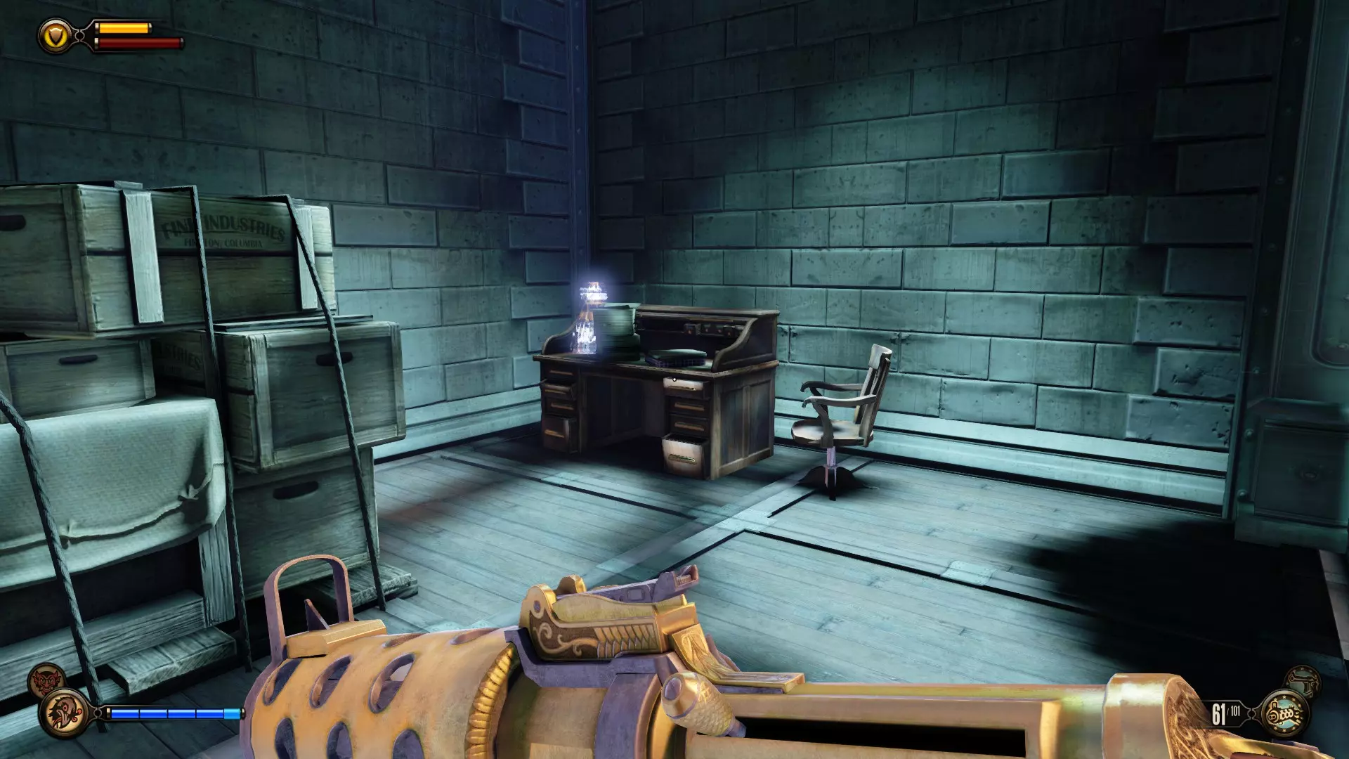 留声机#25 乘坐电梯上楼后,向左走会看到一扇锁着的门。门内有一个炮手炮塔。留声机位于其中一张桌子上。