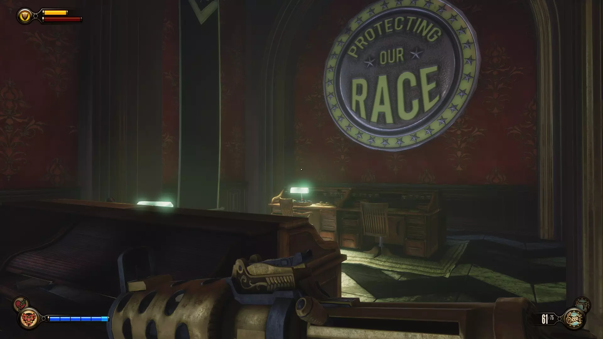 留声机11:在放映机处左转,然后走向标有“保护我们的种族”指示牌的桌子。留声机就在其中一张桌子上。