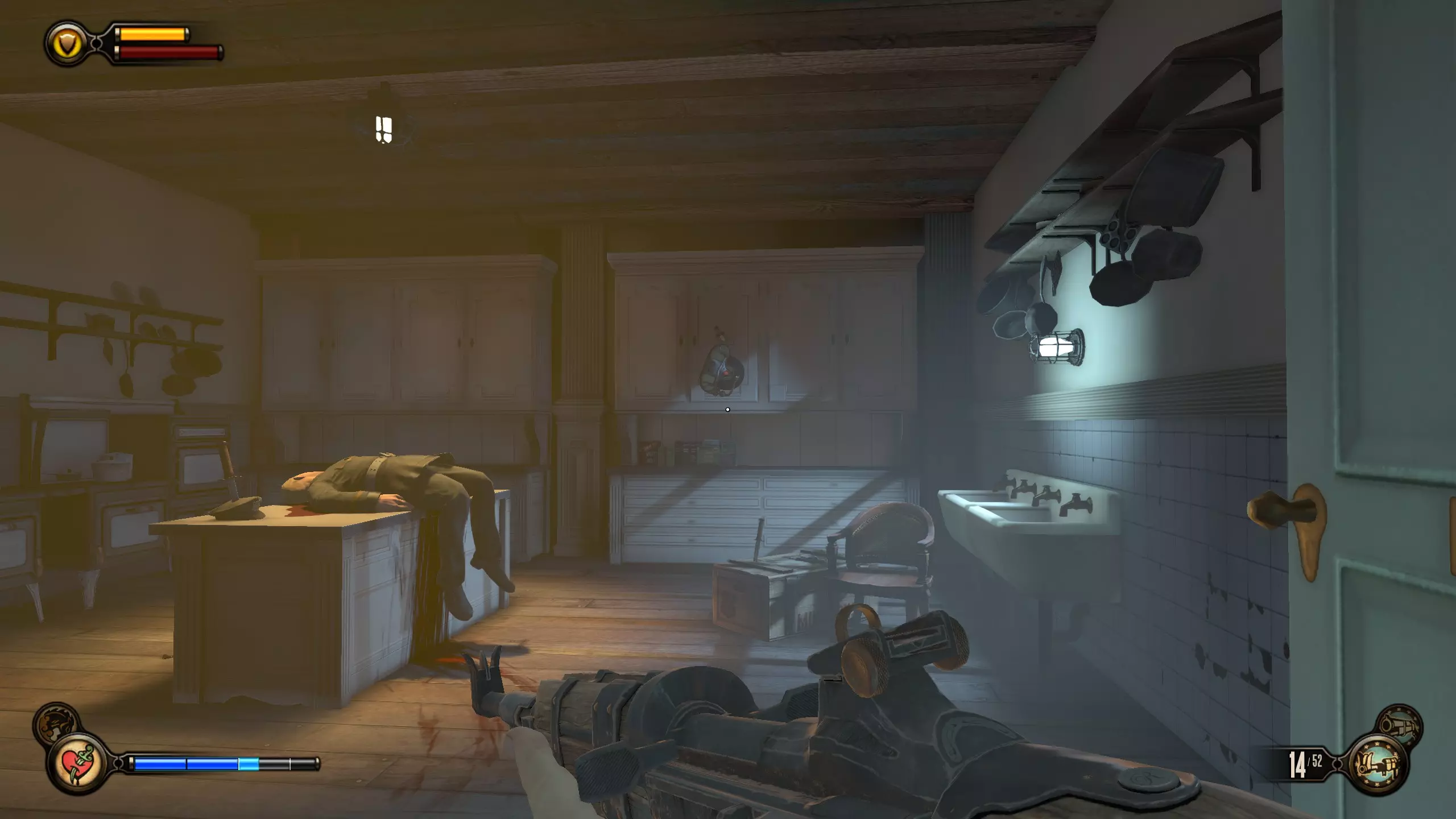 留声机#14 经过中央有三个杠杆且周围带电的房间后,左转进入门内。留声机位于水槽左侧的柜台上。