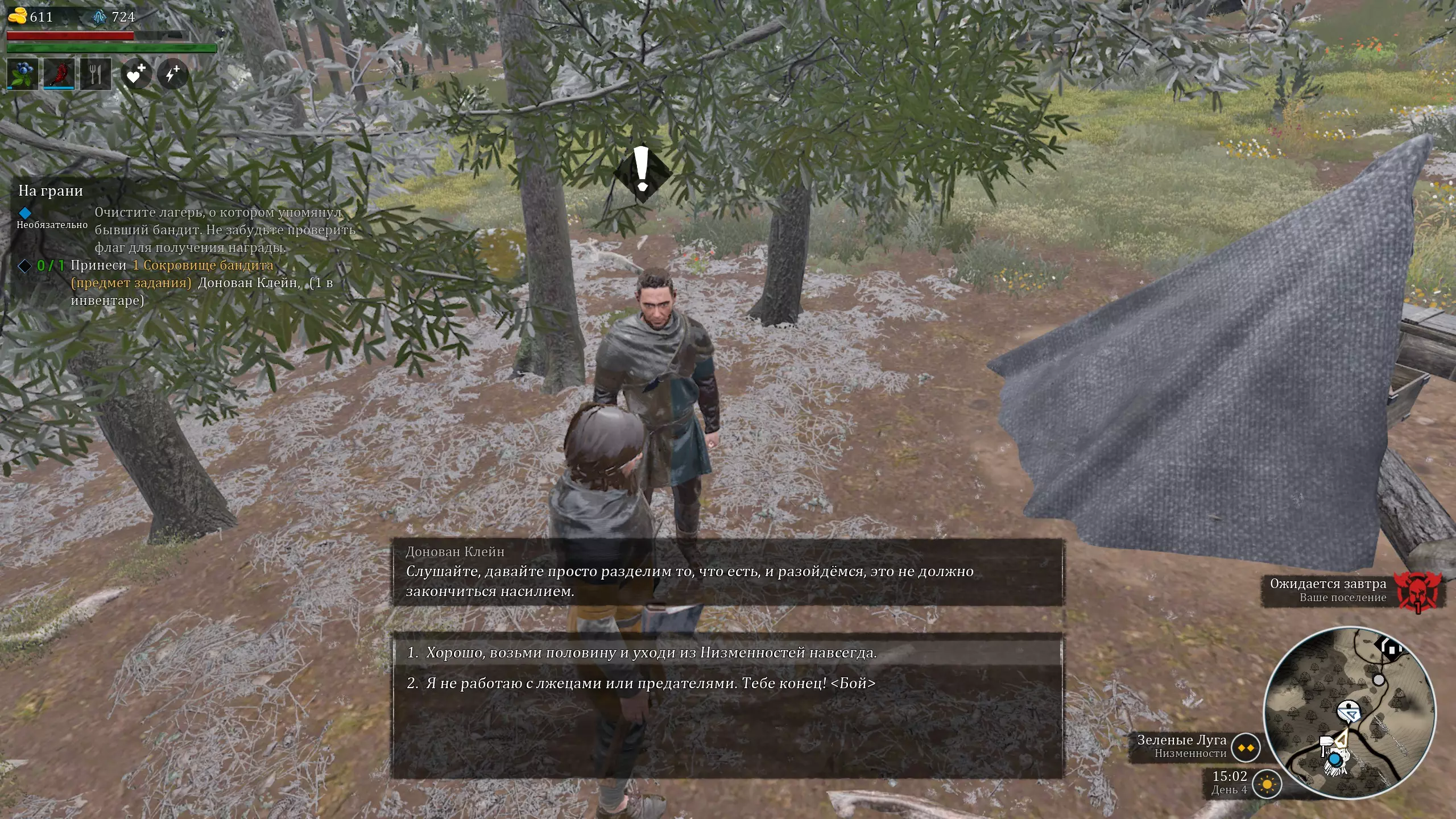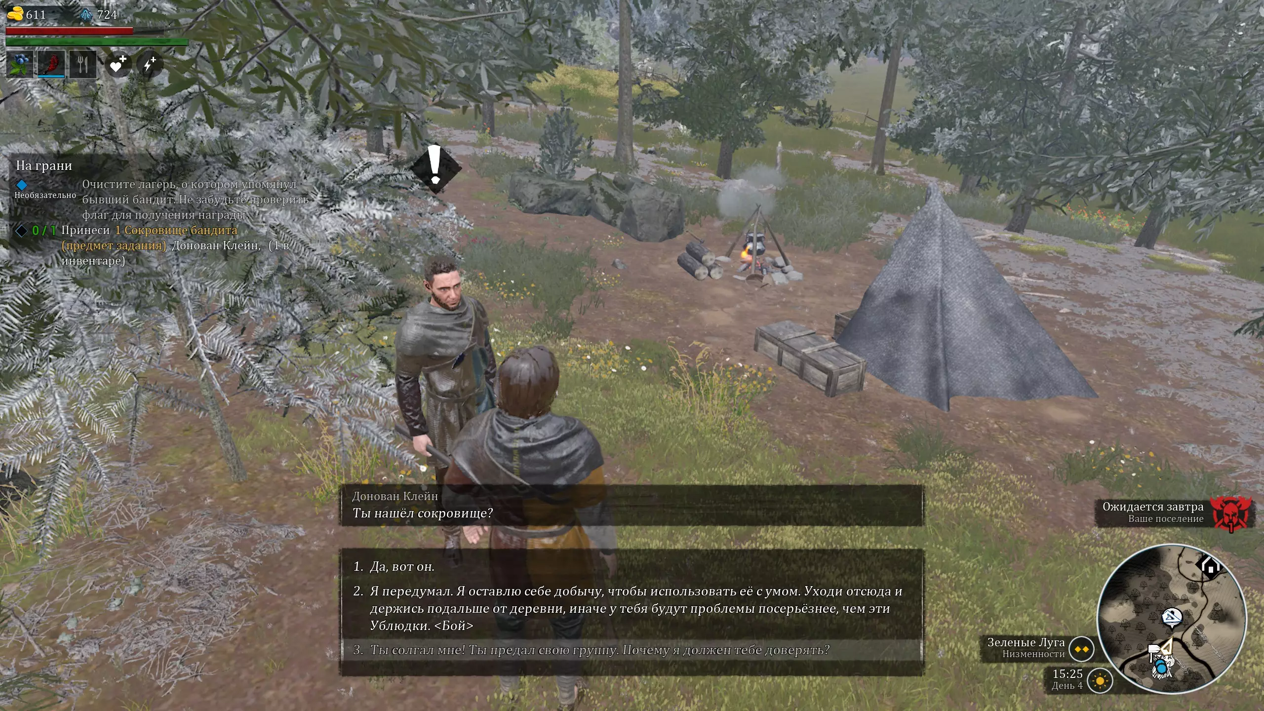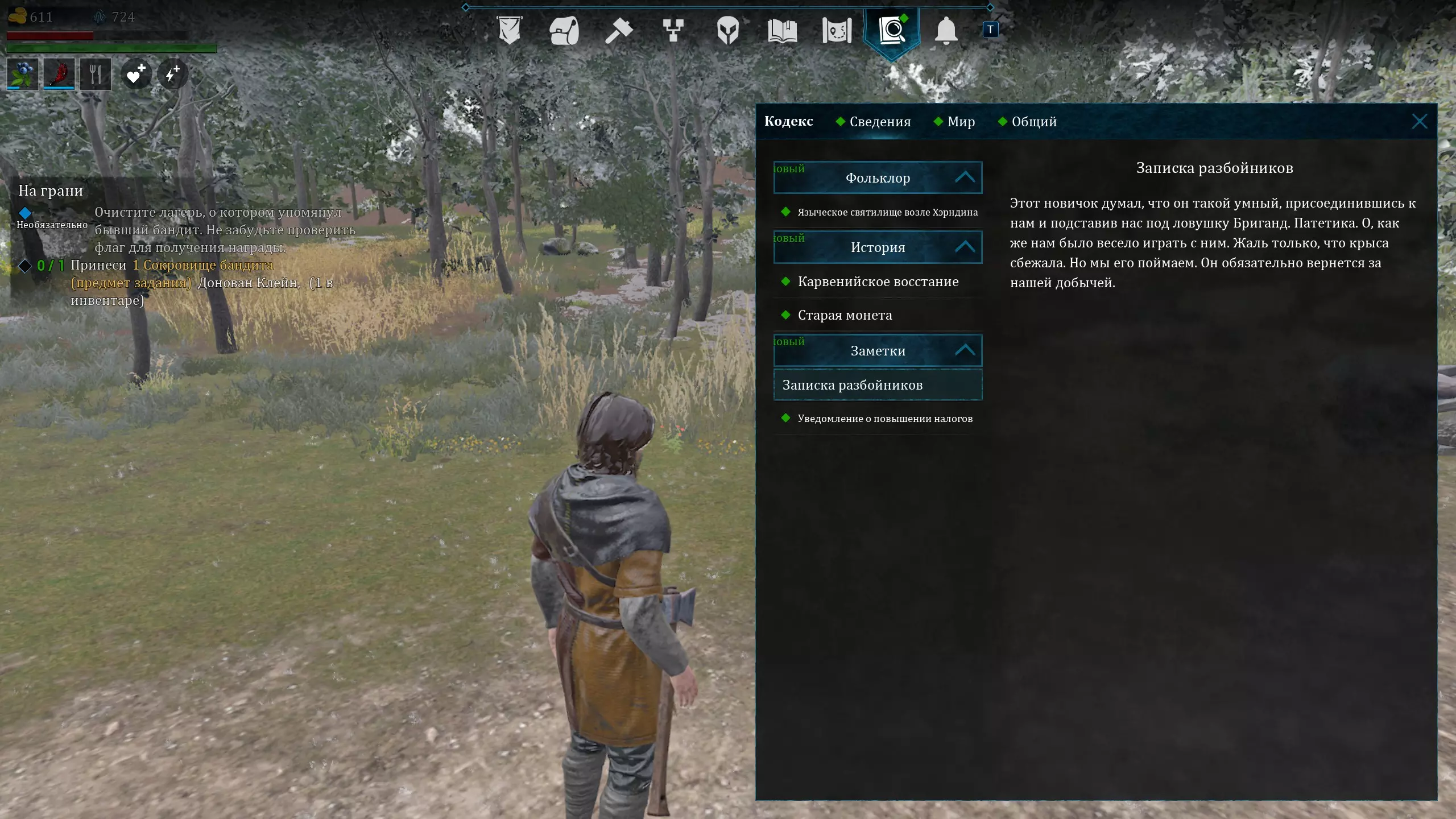 最终,你的背包中应有【宝藏】物品,并且在笔记中有【强盗的字条】。靠近NPC,在此处单独存档(用于获取涉及选择的成就)。选择对话选项: