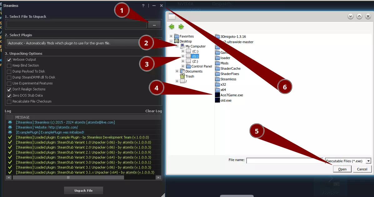 3. 克隆仓库并启动脚本 在终端中,复制粘贴以下命令(使用左扳机键(L2)进行复制/粘贴): git clone [外部链接已屏蔽] cd ac7-ultrawide-steamdeck ./patch.sh 你可以一次性粘贴所有命令。粘贴后按【A】键确认。 这将自动下载所有必要组件并开始安装。 4. 安装过程中的手动步骤 安装过程中,你需要执行一个手动步骤: 步骤1:使用Steamless解包 当出现提示时,点击“选择要解包的文件”附近的【...】按钮。 在资源管理器窗口中:点击“我的电脑”。 打开G盘。 选择Ace7Game.exe文件并点击“打开”。在Steamless中点击【解包文件】,等待出现提示信息:“Successfully unpacked file.”完成后关闭Steamless窗口。