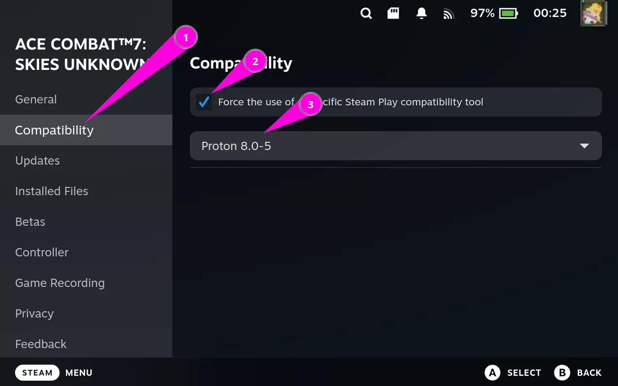 进入兼容性设置,启用【强制使用特定Steam Play兼容性工具】。从下拉菜单中选择Proton 8.0-5。