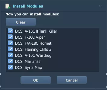 如果正确执行了上一步操作,你会收到“文件夹已存在”的通知,此时请按“是”继续。 正常继续安装,但务必取消勾选“创建桌面快捷方式”复选框。我们将通过Steam启动游戏,而非直接从.exe文件启动。 安装程序完成后,会自动打开下载器(不要在安装程序最后一页取消勾选此框)。 点击这些对话框并等待下载器完成任务。(这可能需要一段时间) 在Steam上打开DCS World。如果能在屏幕顶部看到模块管理器按钮,说明安装成功。(可能会要求登录,请使用你的DCS网站凭据)