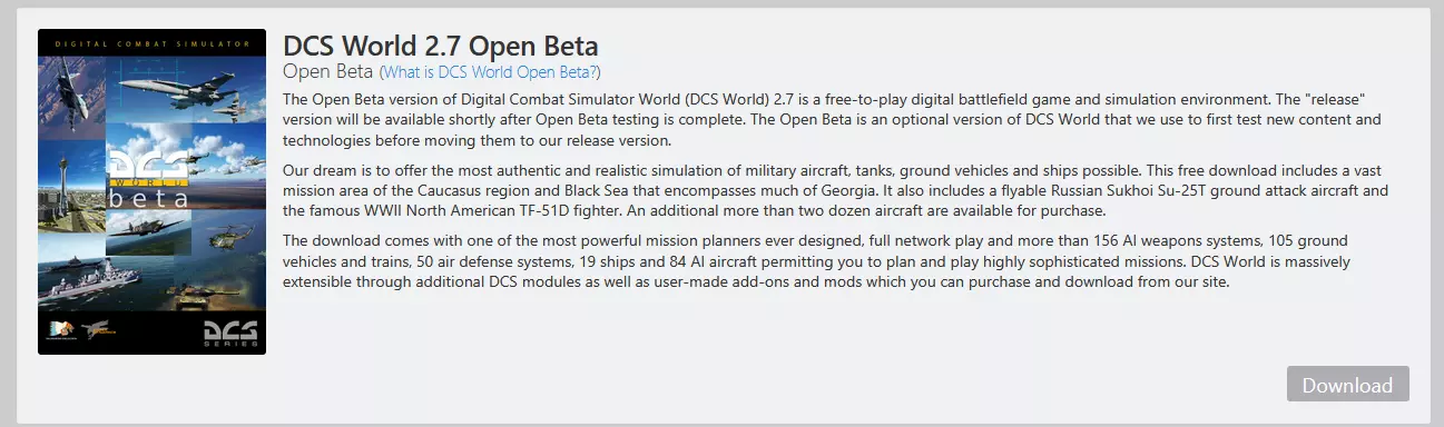登录后,你将被重定向回个人资料页面。向下滚动到Steam账户部分,点击【获取许可证】。 页面会再次刷新,你应该会看到一条消息:【以下产品许可证可转移至你的DCS账户】。如果看到此消息,点击【转移许可证】。如果没有,请尝试再次点击【获取许可证】。 操作完成,你已成功将所有Steam版DCS World的DLC迁移至独立版! 版本合并 现在我们已经完成了前期步骤,可以开始合并版本了。在继续之前,请前往DCS World下载页面,下载与你正在使用的版本(DCS World 2.7或DCS World 2.7开放测试版)相关的可执行文件。对我来说,我正在使用开放测试版,所以我会点击这个的下载按钮。