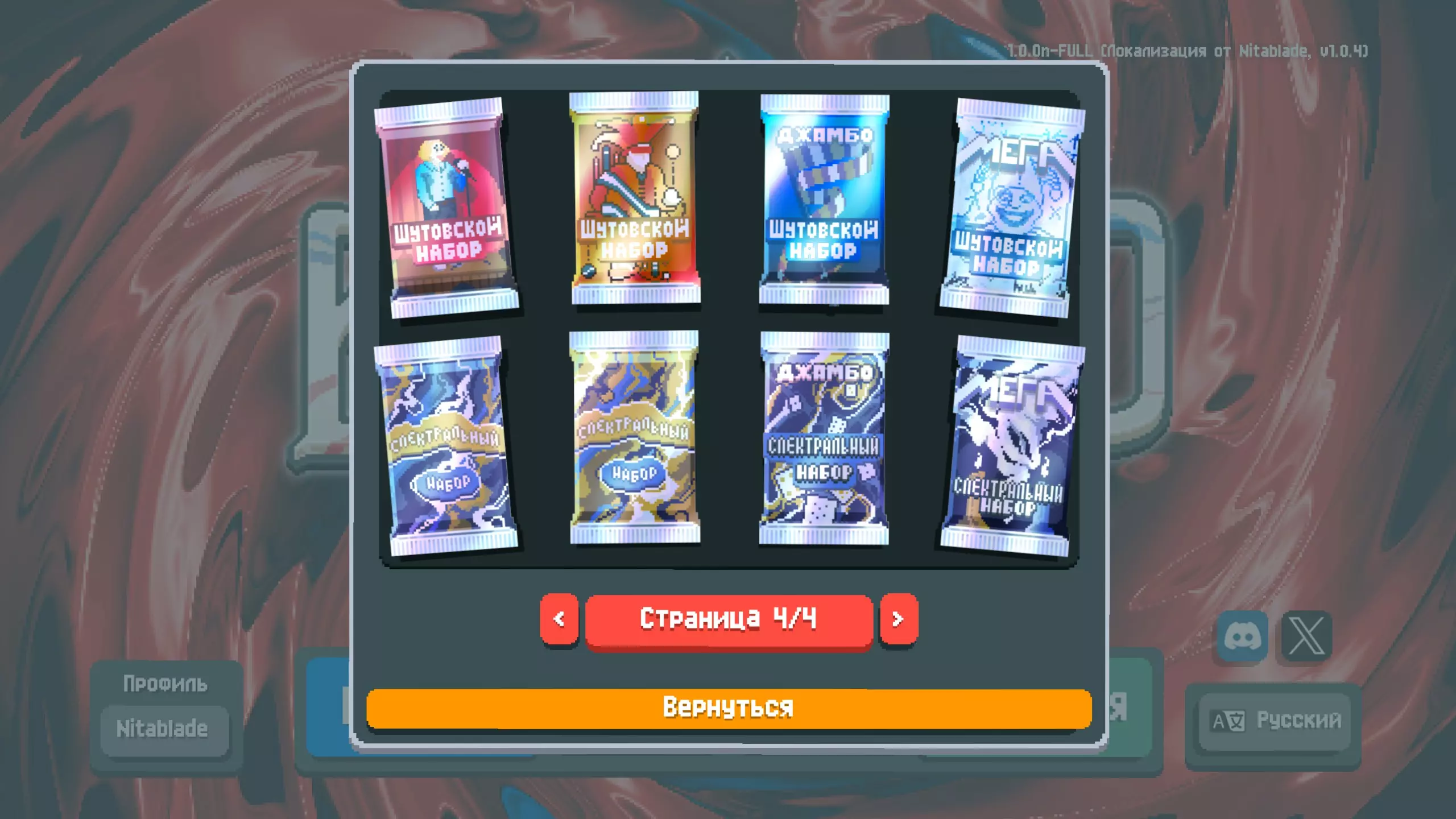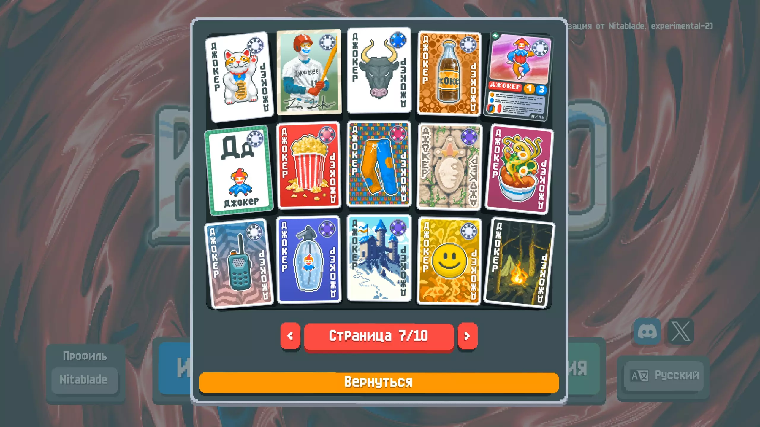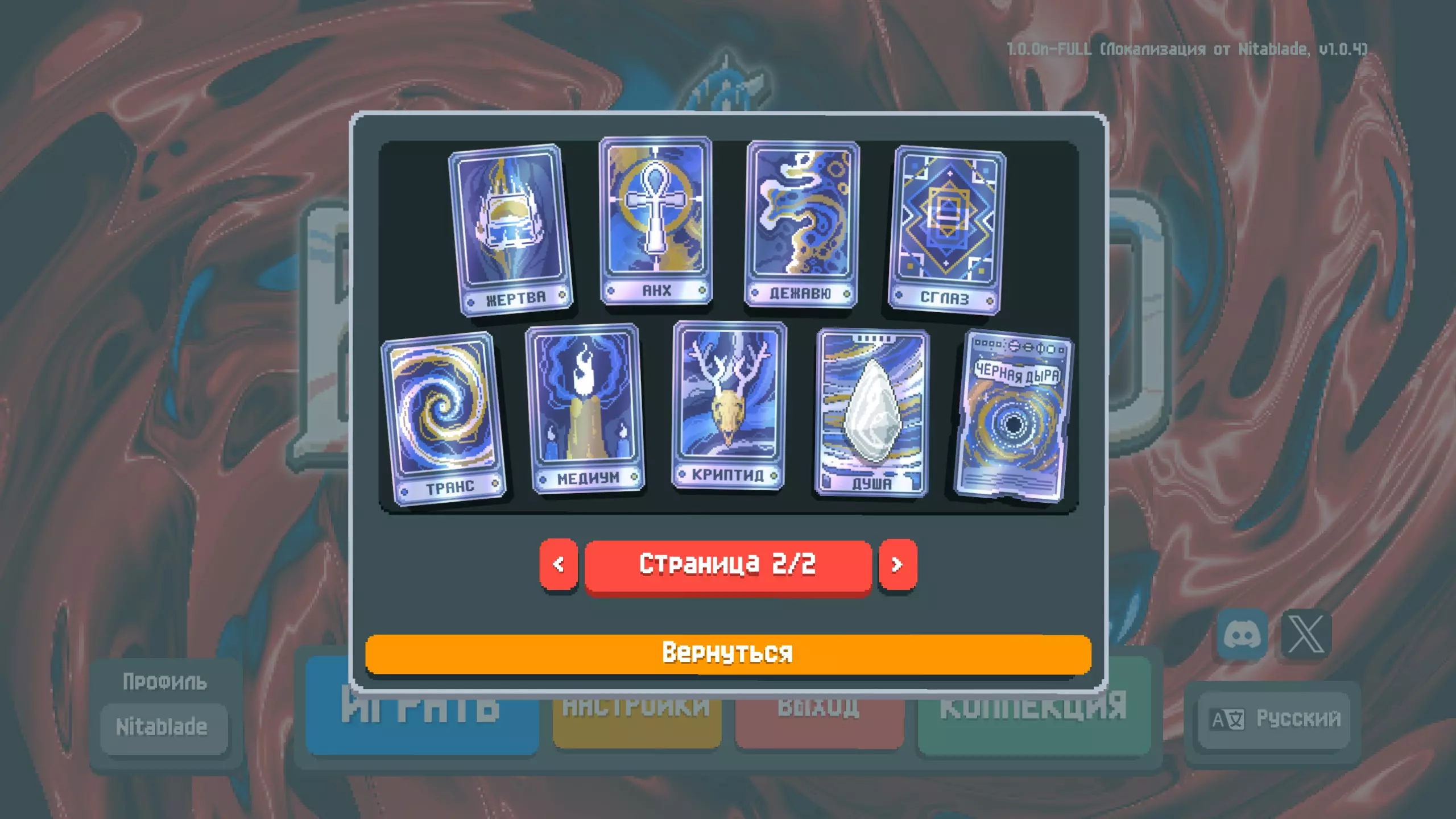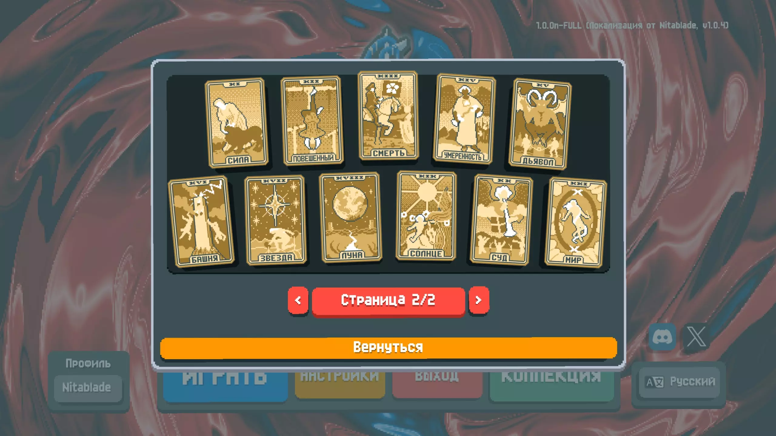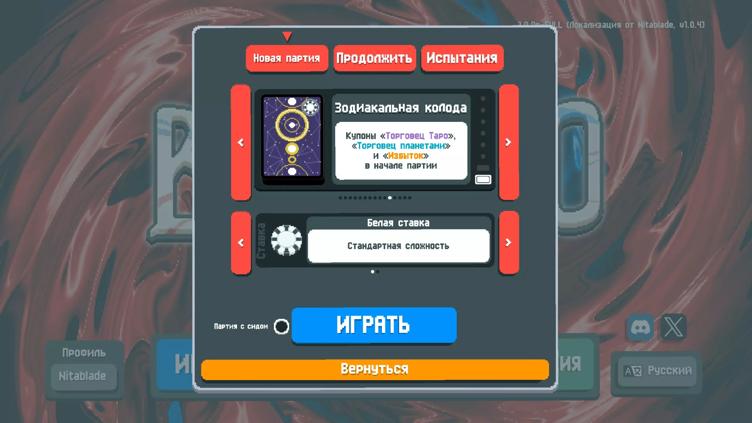 这是我为《巴拉丁洛》制作的俄语本地化补丁。 这是《巴拉丁洛》的俄语本地化补丁(来自Nitablade)。 既然游戏中已经有俄语了,为什么还要做这个呢?因为官方翻译还有很多不足之处,并且存在许多错误和不准确的地方。我的本地化主要特点: - 统一的书写风格,在所有可能的地方保持一致 - 为所有小丑牌、优惠券、星球地图、塔罗牌、光谱卡、补充包及其他物品添加了俄语化纹理 - 手动为原本不支持翻译的文本行添加了本地化内容 - 修正了“Получает”“Даёт”等不正确的关键词- 在文本中使用字母"ё" - 为部分卡牌描述补充仅游戏官方维基才有的额外隐藏信息 - 本地化并非严格遵循英文版本的表述,而是力求做到尽可能简洁易懂 该模组还将字体替换为经过改良的Mini Pixel 7,虽未刻意模仿原版字体,但仍保持像素风格,具有良好的可读性并与游戏设定相契合如果需要,可以将字体替换为其他任意字体。为此,在已安装的模组文件夹中,将所需字体文件重命名为NotoSans-Bold.ttf后进行替换。 安装仅需Lovely注入器(已包含在压缩包中),无需启动器。借助Lovely,游戏更新时翻译不会丢失,但如果游戏中出现新内容,我仍计划继续维护本地化。如何安装(适用于Windows系统):详细指南请参考相关发布页面。 附加选项:从模组1.0.5版本开始,附加字体及其他非必要安装选项已移至/extra文件夹。若要启用这些选项,只需替换现有文件即可。目前可用的额外元素如下: - 额外字体(复制原版m6x11plus的风格) - 扑克牌的俄语化字母(В - 杰克,Д - 皇后,К - 国王,Т - 爱司),适用于普通模式和高对比度模式 已知缺陷: - 在“残酷”试炼的规则列表中,关于无奖励盲注的行显示了两次