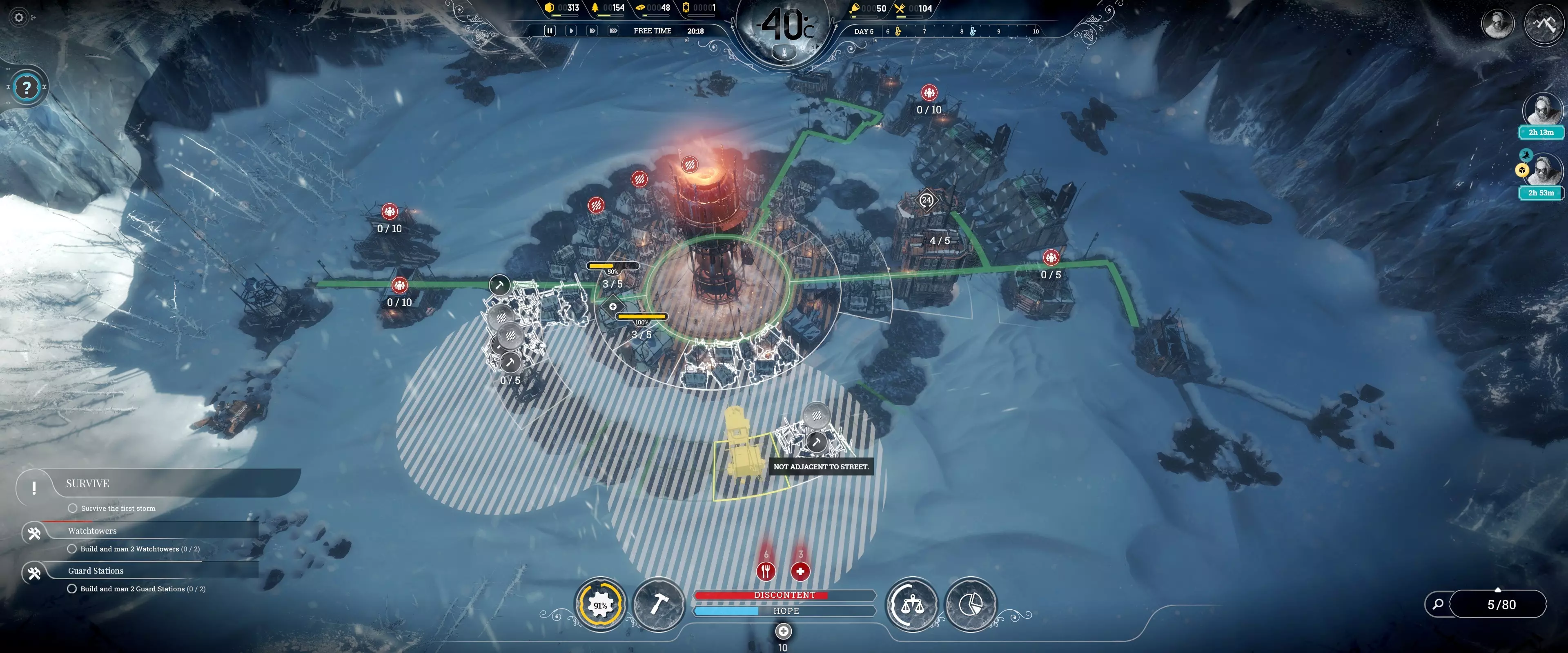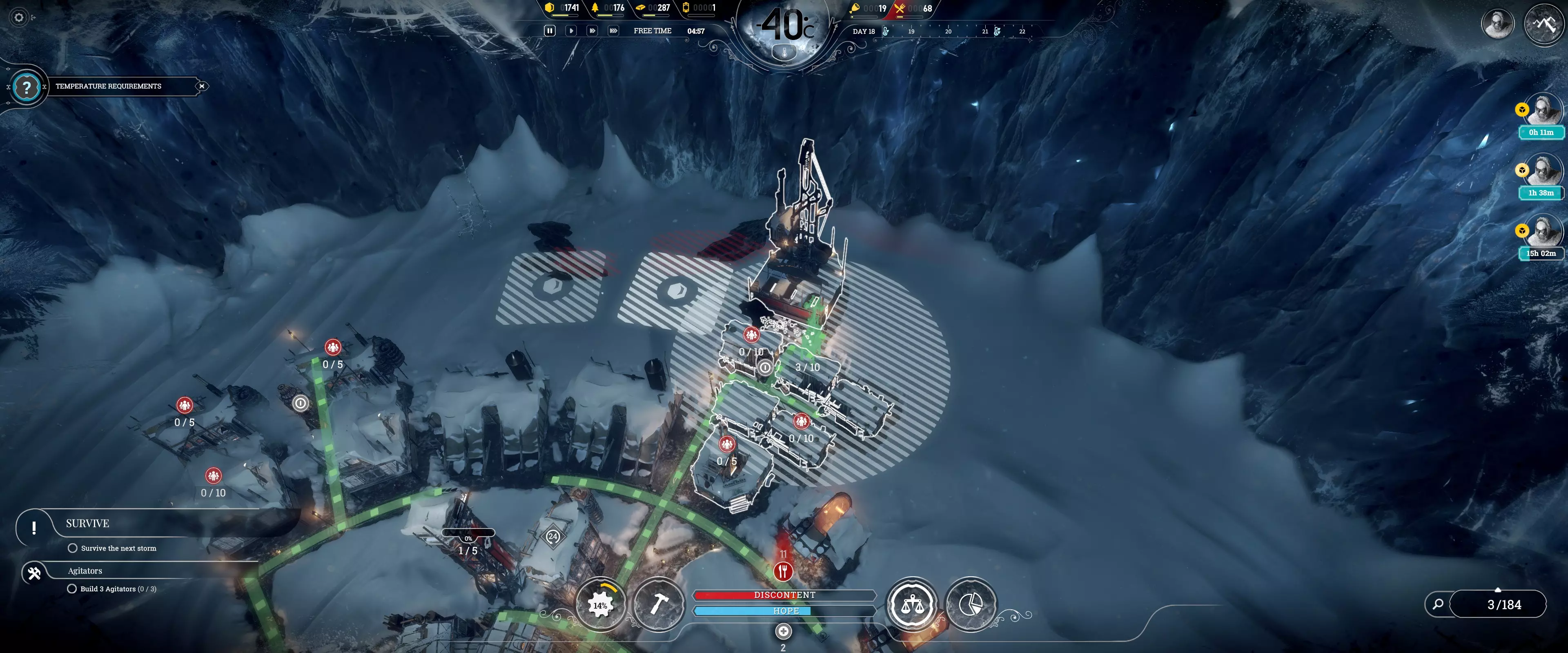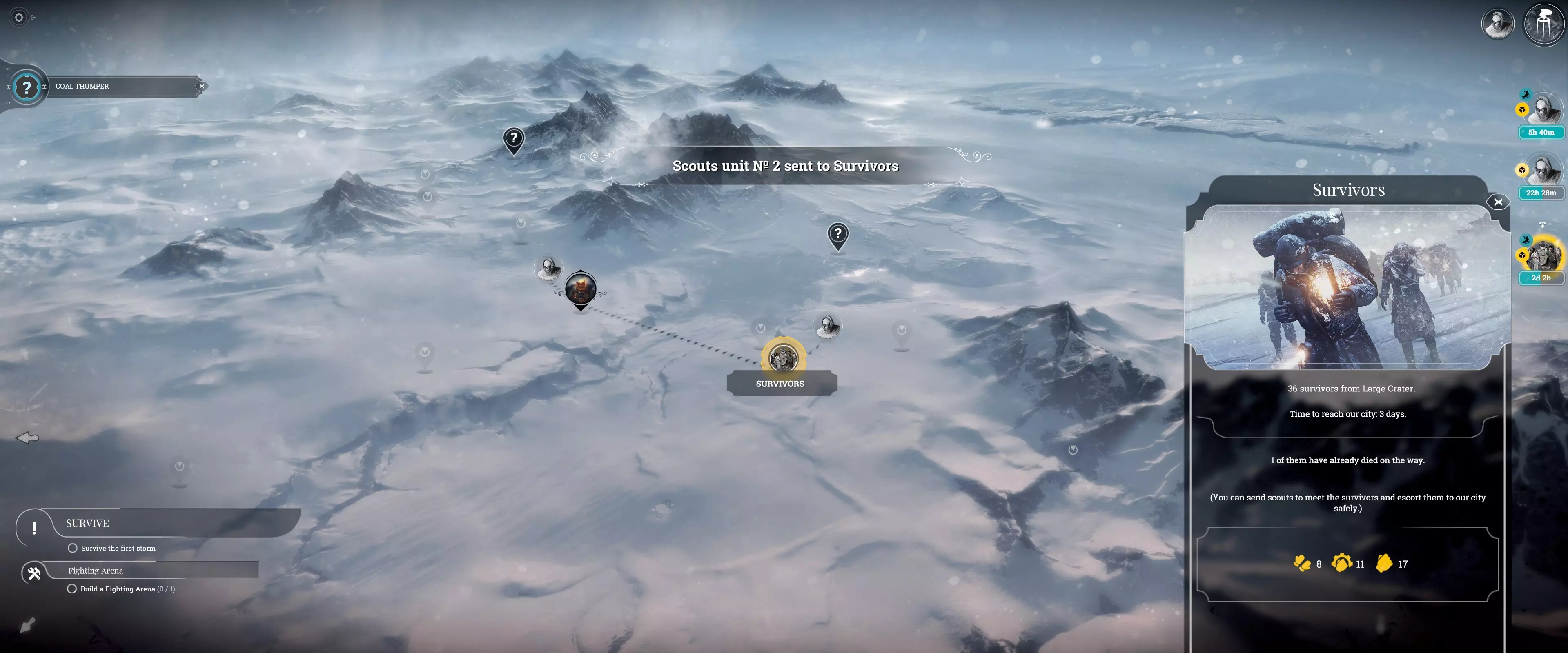 “病患额外食物配给”法案可进一步提升效率,具体提升幅度为50%-70%,取决于基础数值。 注:普通疾病可在4小时或更短时间内治愈。 常见错误(禁止事项) 1. 拒绝所有“为房屋供暖”和“常规工作班次”任务! 这些任务会浪费煤炭,且在开局阶段至关重要时会阻碍额外生产。信仰守护者和守卫在拒绝常规工作班次任务时可消除不满惩罚。希望值仅在出现死亡时才会成为问题(本指南中不会出现死亡情况)。 2. 绝不要让重病患者担任侦察兵! 他们在被解散后有治疗时限。如果病情过重,他们需要一直担任侦察兵。 3. 避免浪费煤炭!过载功能可以在需要更多发电机功率时节省煤炭,而无需消耗更多煤炭。但要注意不要让压力超过95%。 4. 确保所有人健康! 如果居民的房屋在睡眠时间(23:59)前至少达到宜居条件,他们生病的可能性会降低。发电机大约需要45分钟提升一个温度等级,必要时可以开启过载功能。 注意:猎人需要在白天睡觉,且他们的房屋需要供暖。 侦查:有用信息 风暴的出现与否取决于场景,它会杀死路径上的所有人,从而使侦查工作变得复杂。需要仔细规划侦查路线以及何时将侦查队召回。侦查的目的是获取更多幸存者以增加人口,并获取蒸汽核心用于后期基础设施建设。如果遭遇风暴,基础侦察兵无法逃脱。风暴可能从四面八方袭来,而非仅从北方出现。需要先存档再快进进行精确计算,以判断他们能否安全返回基地。 侦察:最佳使用方法 每个小队需专注于不同的大致方向(北、南、东、西),以覆盖更多区域获取最多奖励。
