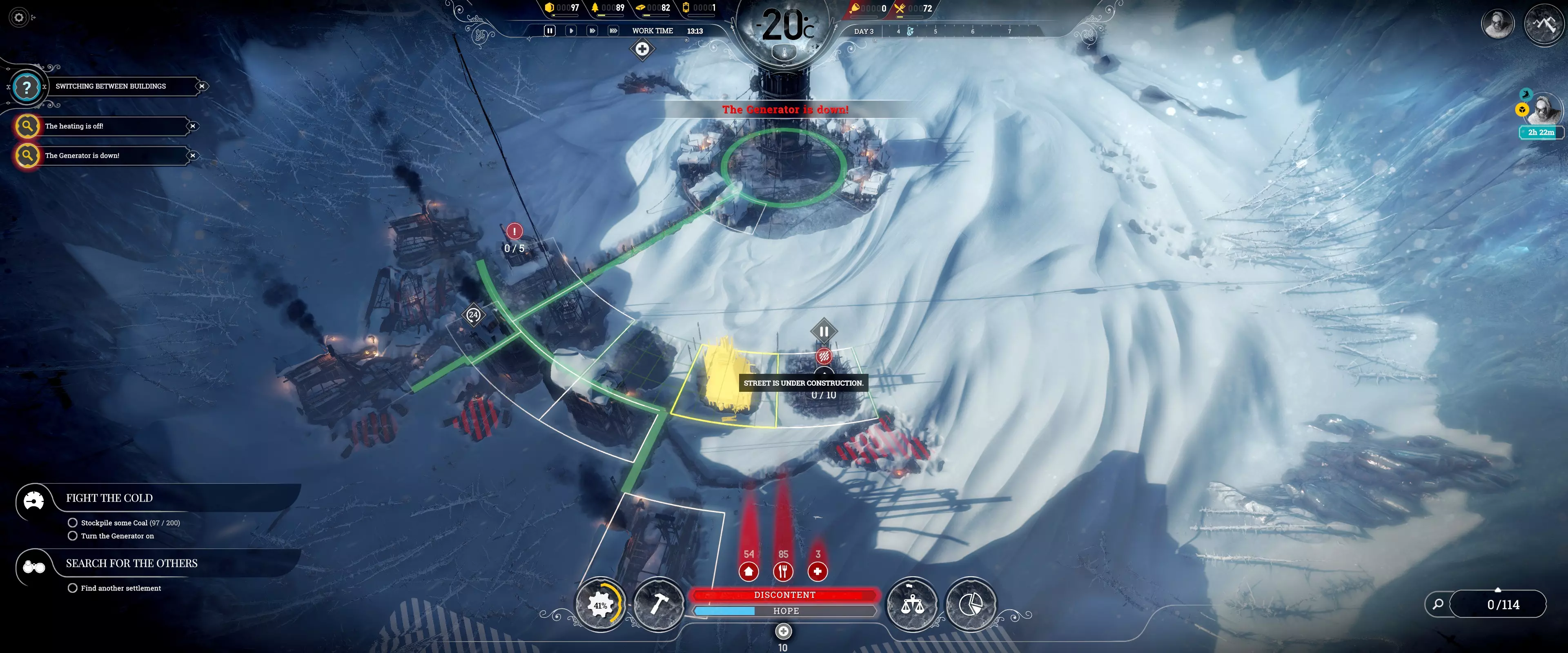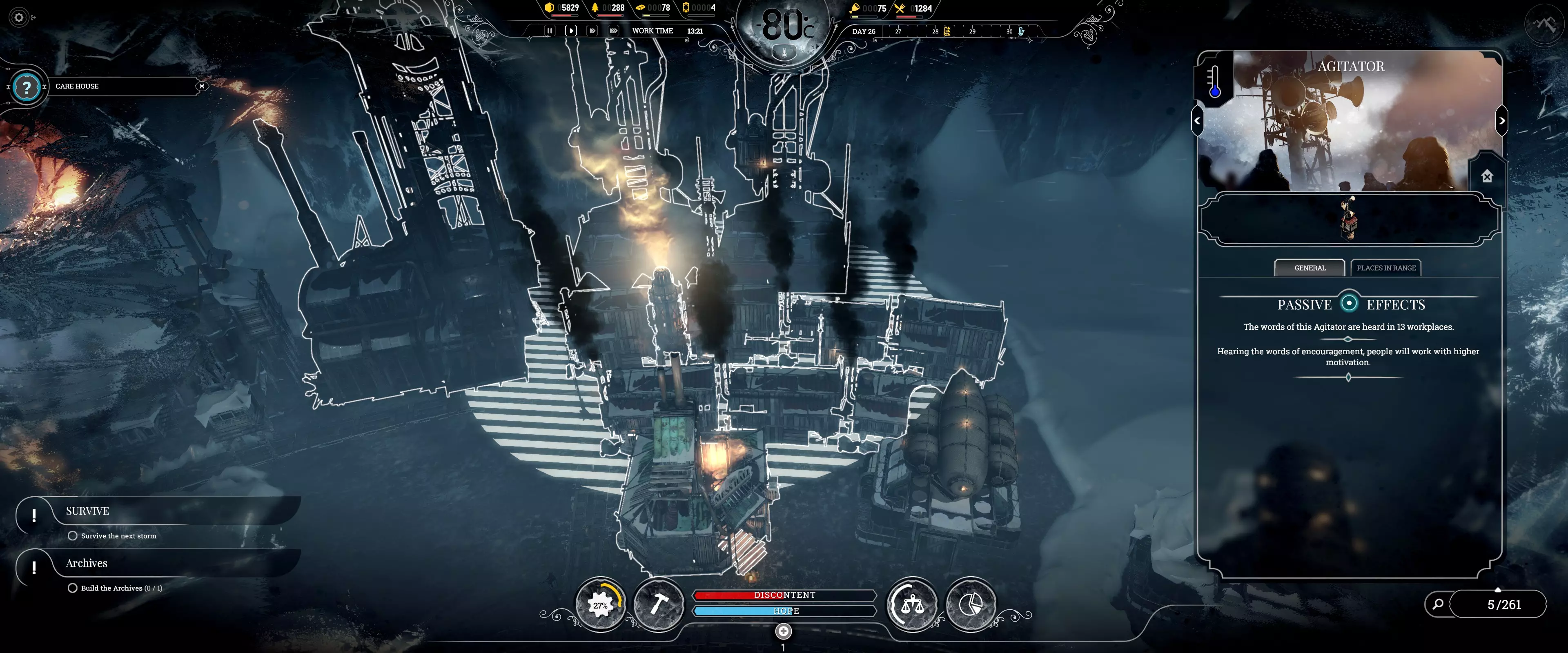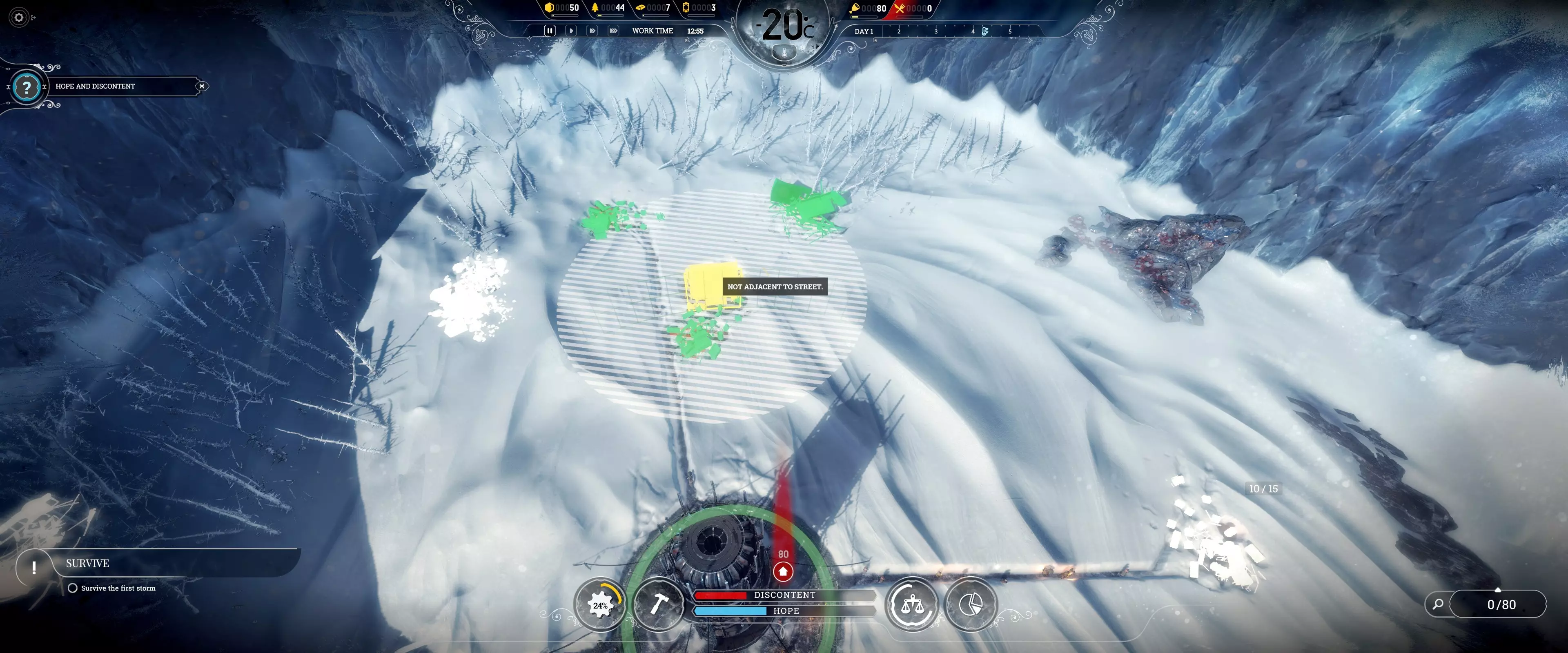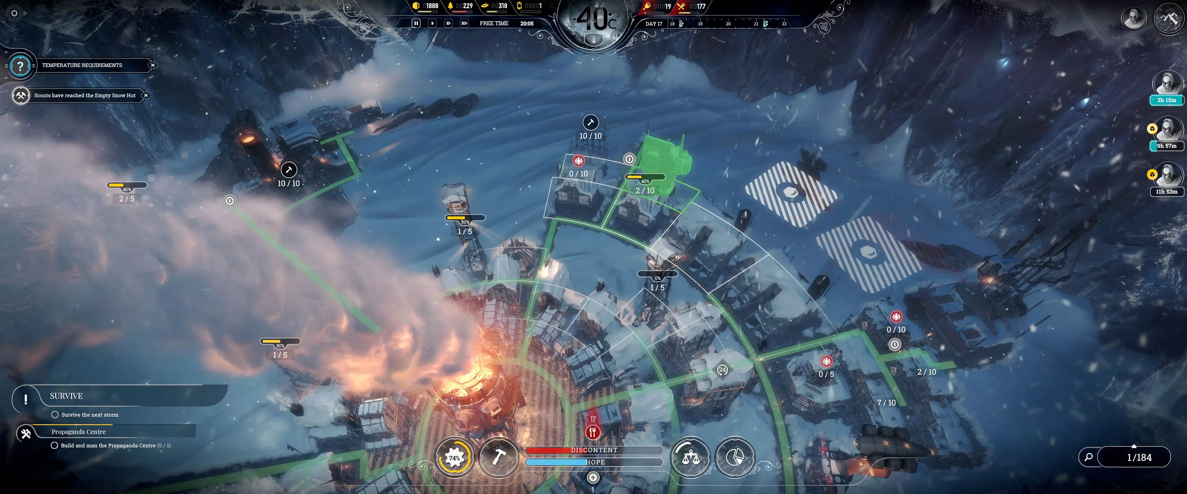 “病患额外食物配给”法案可进一步提升效率,具体提升幅度为50%-70%,取决于基础数值。 注:普通疾病可在4小时或更短时间内治愈。 常见错误(禁止事项) 1. 拒绝所有“为房屋供暖”和“常规工作班次”任务! 这些任务会浪费煤炭,且在开局阶段至关重要时会阻碍额外生产。信仰守护者和守卫在拒绝常规工作班次任务时可消除不满惩罚。希望值仅在出现死亡时才会成为问题(本指南中不会出现死亡情况)。 2. 绝不要让重病患者担任侦察兵! 他们在被解散后有治疗时限。如果病情过重,他们需要一直担任侦察兵。 3. 避免浪费煤炭!过载功能可以在需要更多发电机功率时节省煤炭,而无需消耗更多煤炭。但要注意不要让压力超过95%。 4. 确保所有人健康! 如果居民的房屋在睡眠时间(23:59)前至少达到宜居条件,他们生病的可能性会降低。发电机大约需要45分钟提升一个温度等级,必要时可以开启过载功能。 注意:猎人需要在白天睡觉,且他们的房屋需要供暖。 侦查:有用信息 风暴的出现与否取决于场景,它会杀死路径上的所有人,从而使侦查工作变得复杂。需要仔细规划侦查路线以及何时将侦查队召回。侦查的目的是获取更多幸存者以增加人口,并获取蒸汽核心用于后期基础设施建设。如果遭遇风暴,基础侦察兵无法逃脱。风暴可能从四面八方袭来,而非仅从北方出现。需要先存档再快进进行精确计算,以判断他们能否安全返回基地。 侦察:最佳使用方法 每个小队需专注于不同的大致方向(北、南、东、西),以覆盖更多区域获取最多奖励。
