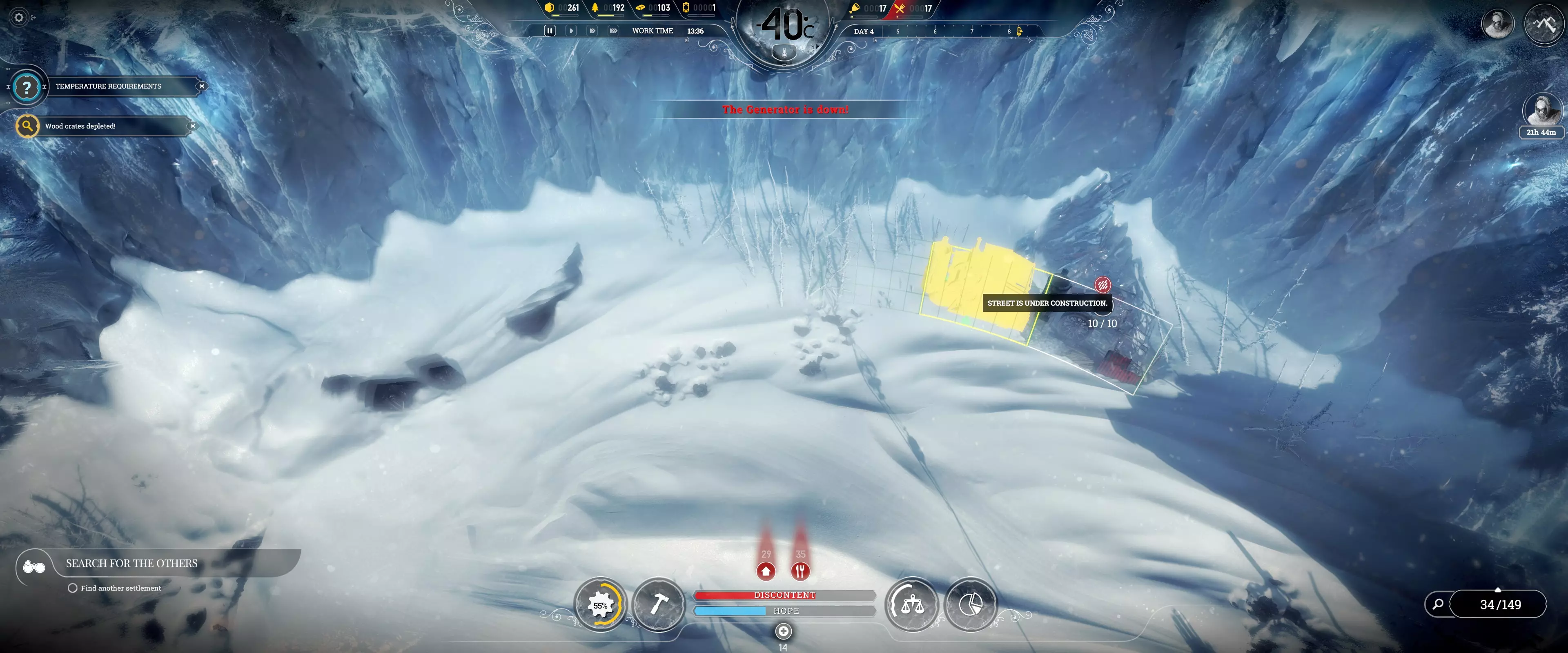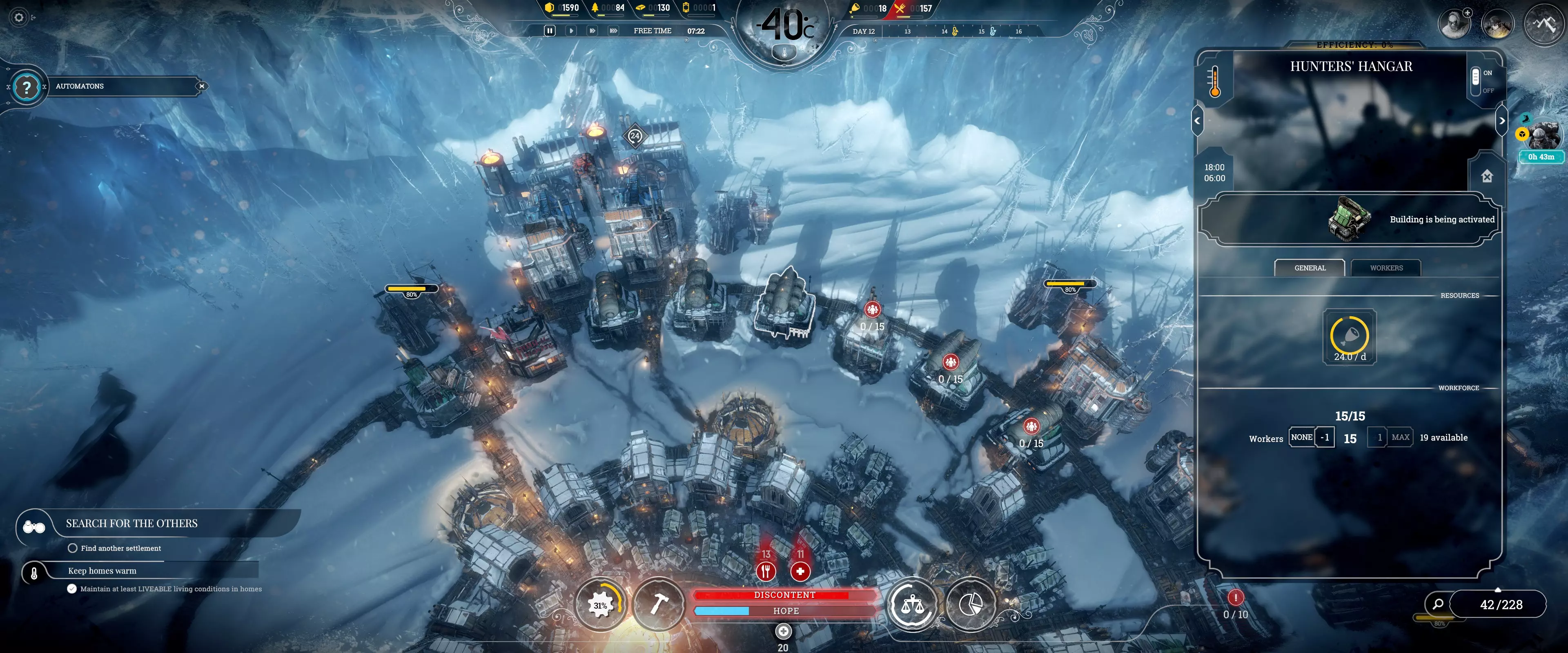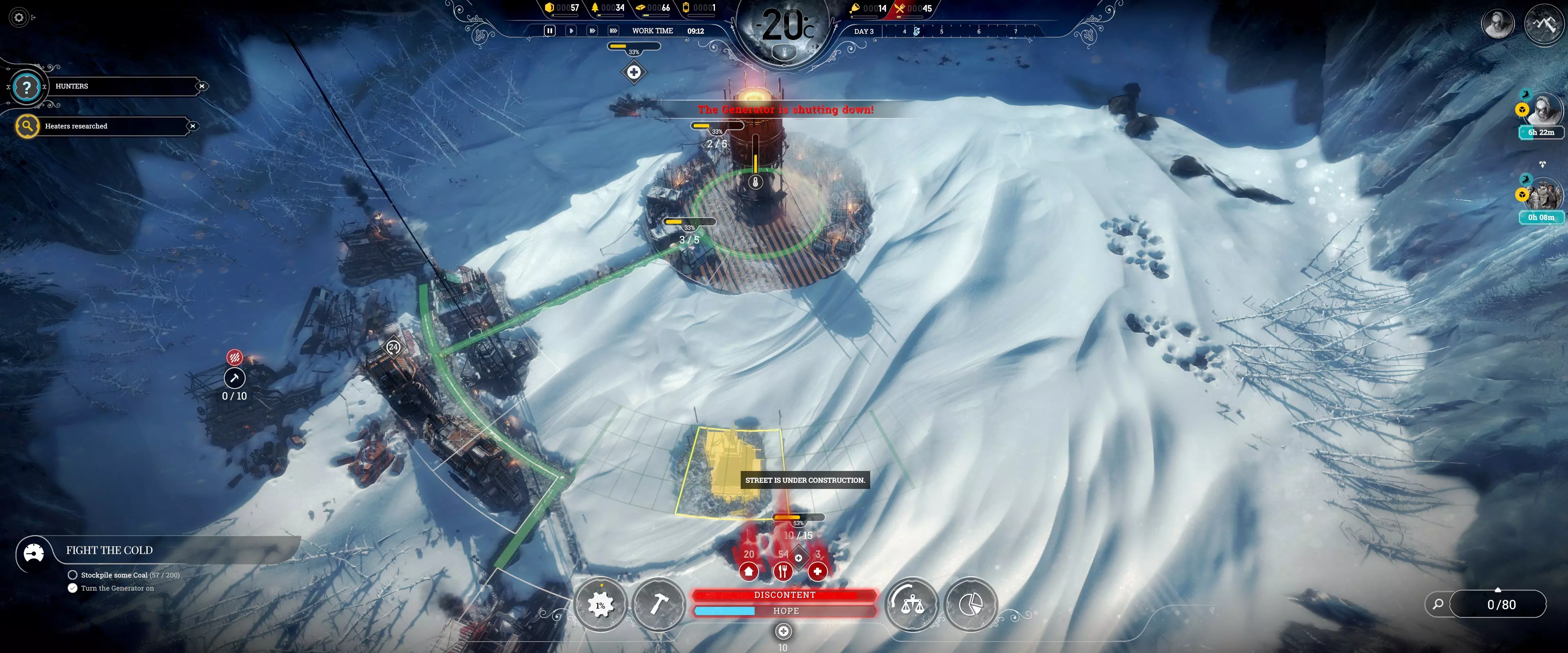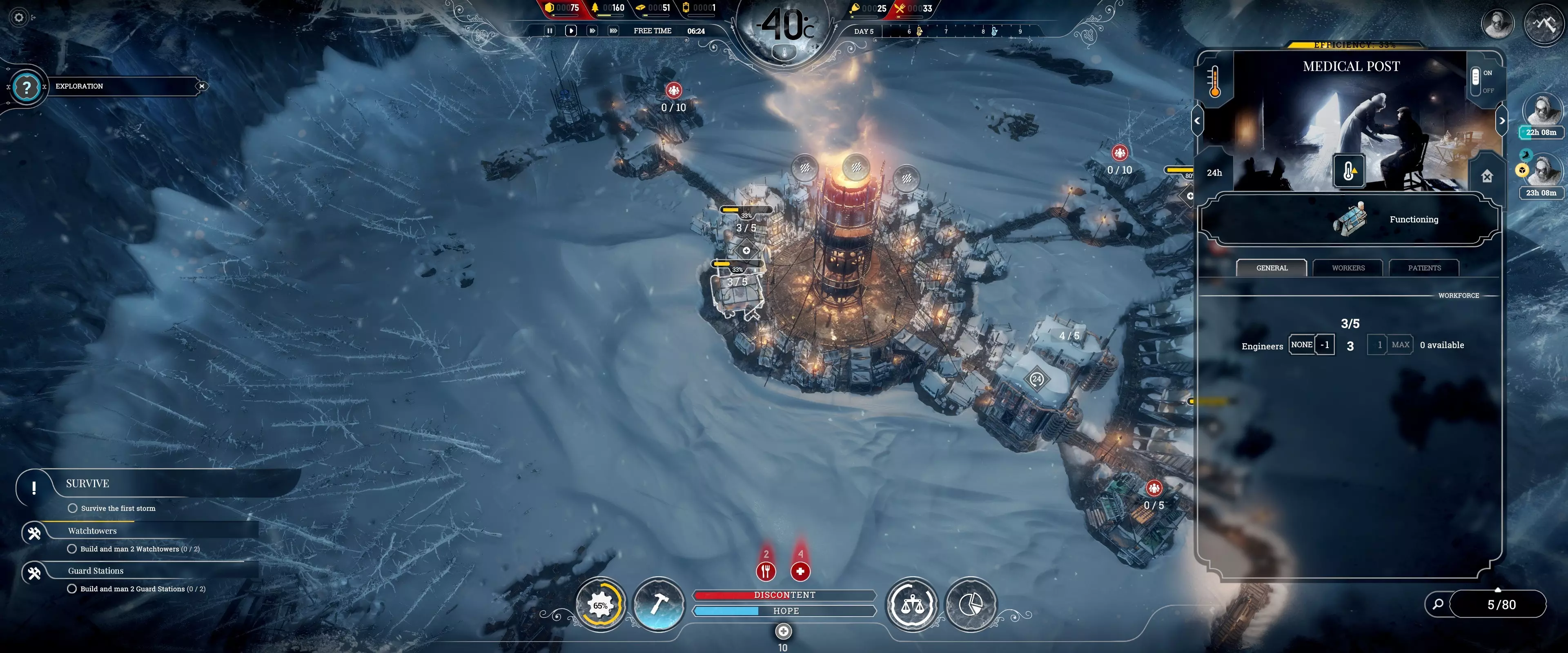 工程师仍可在其他地方工作,但治疗时间会延长。 2. 将病人与健康人分开! 正在接受治疗的人员无法工作,需要通过解雇将其移除。如果有可用人员,健康人可以通过重新安排人员来接替工作。 3. 除非立即需要,否则在工作班次开始前暂停建设! 注意:由于建造、进食或接受治疗,工作效率并非总能达到100%。 狩猎无需全员参与 狩猎于18:00开始,任何有能力的工人都可以参与。部分人员参与狩猎可让其他人完成日常工作直至20:00。