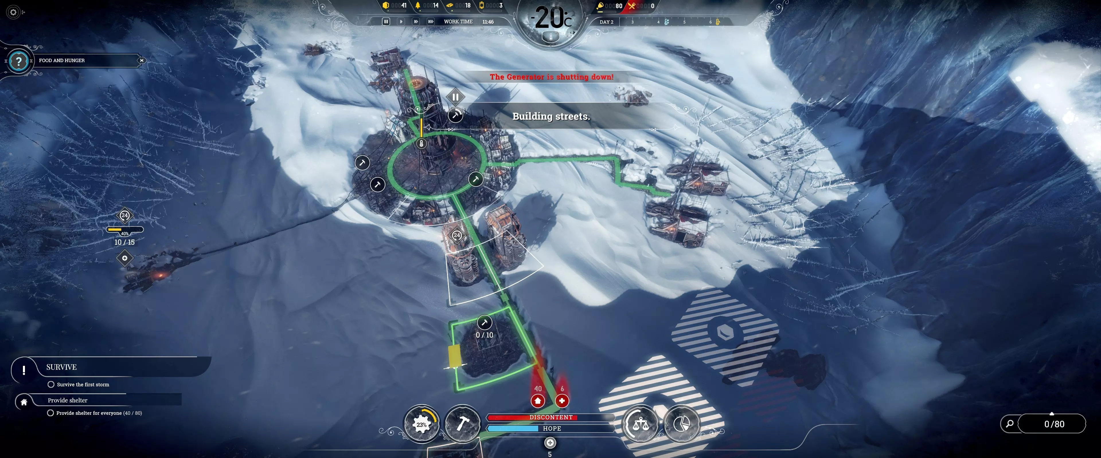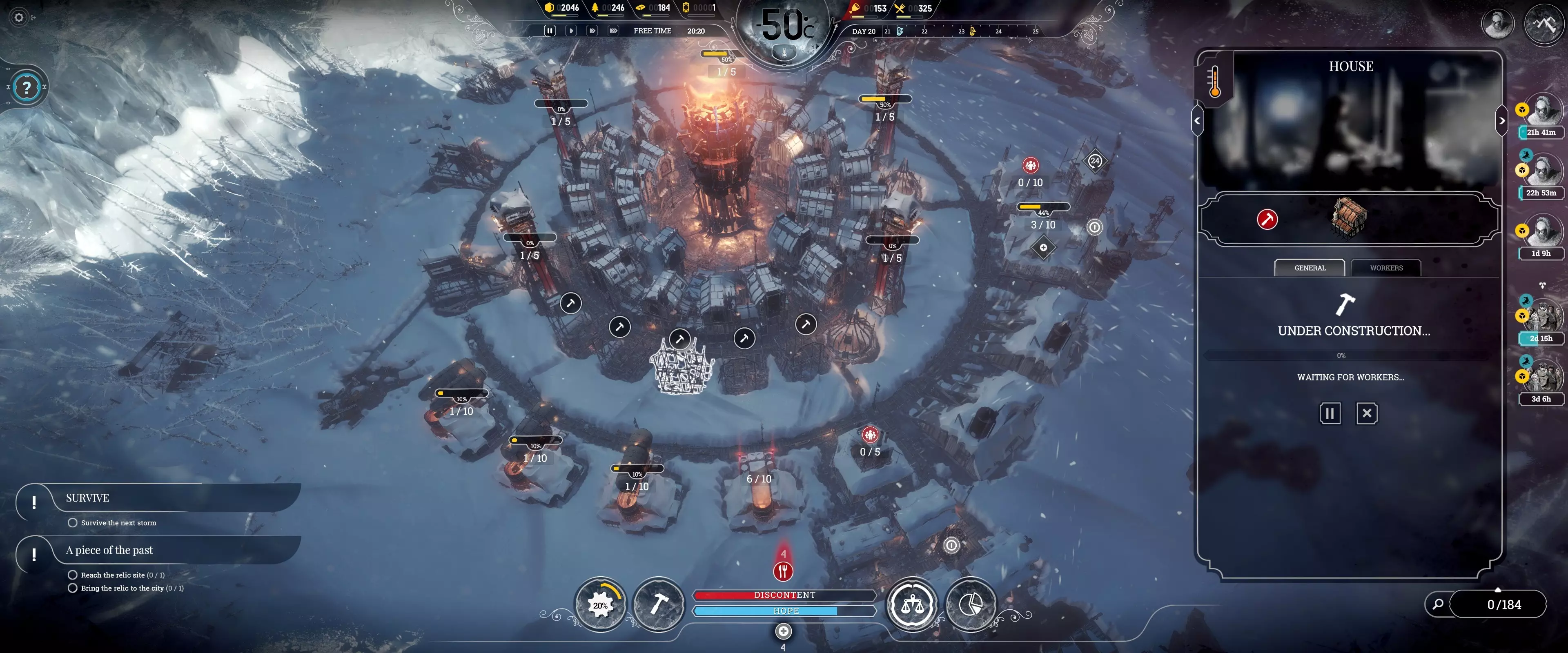 他们可以在此期间探索其他区域,最好能提升移动速度。 平息叛乱 追求完美的关键在于,当不满度或希望值(仅因死亡导致)濒临极限时,不要触发最终警告(叛乱)事件。游戏初期需要不断研究和生产以确保城市生存。使用紧急班次和工头的隐患在于会产生额外的不满度和食物消耗这一隐藏成本。 叛乱最可能因高不满度引发,且同一天内不会发生两次。不满度大致达到120%时就会变得难以控制。可以通过取消延长工作时间和为寒冷的房屋供暖来立即降低不满度。特定能力可以进一步将不满度降至100%以下,但需要把握好时机。注意:在同一天解决叛乱后,可以激活另一个紧急班次! 紧急班次 游戏初期,只有工坊需要24/7不间断运作以加速重要研究。每晚应至少在一个工坊使用紧急班次,并与工头能力配合使用,以充分利用24小时效率提升持续时间。