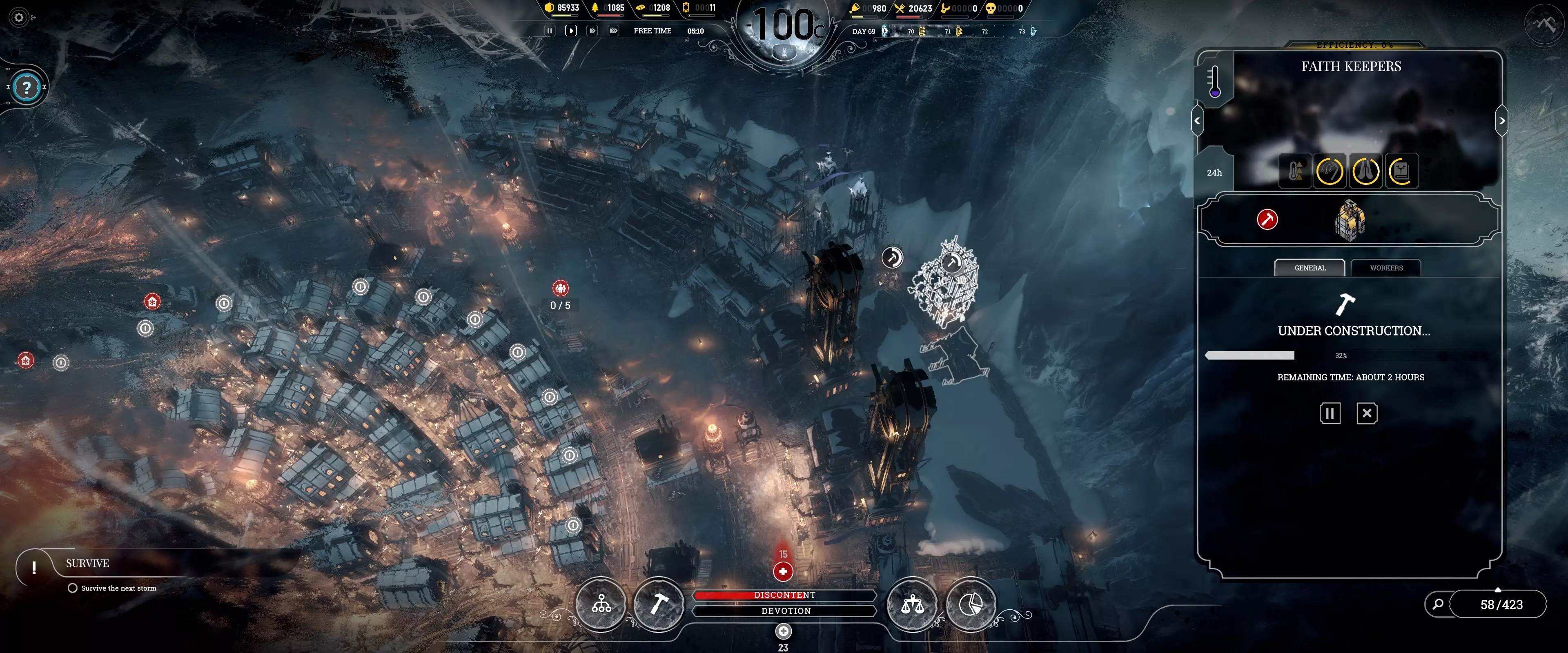 目前还没人找到能让员工全天候不间断工作且避免死亡的诀窍。 激活全天候工作数小时后,会收到员工过劳死的通知。解决方法是:加载更早的存档,并在记录的死亡时间前解雇所有员工。至少半小时后,方可安全恢复工作。 注意:多存档能让此类操作更轻松,且每次最多安排2次紧急班次。 自动机器人:其他紧急班次 只有在蒸汽核心过剩时,才应建造这些机器人。它们最适合在非工作时间用于重要建筑,以及像暴风雪期间等极度寒冷的危险工作场所。 在某些场景中,人口会大幅增长,导致失业问题变得难以解决。自动机械将进一步加剧问题,因此其数量必须与必要工作岗位的数量相匹配。 适应与目标(秩序)法案 早期法案侧重于最大化产量并减少不满情绪,以获得更多紧急班次。秩序路线能显著提升产量,从长远来看效果良好。新信仰路线则适用于希望值存在严重问题的场景。 1. 紧急班次 2. 延长工作时间 3. 儿童安全工作(无需所有工作岗位) 4. 邻里守望 5. 警戒塔 6. 维持生命(为医务室争取更多时间) 7. 晨间集会 8. 工头(24小时效率提升) 9. 病患额外配给(大幅提升治疗效果) 10. 角斗场 11. 巡逻 12. 酒馆 13. 尸体处理(未使用) 14. 器官移植(加快治疗速度) 15.宣传部门(失业或拆除以避免剧情杀) 16. 鼓动者(进一步提升效率) 17. 私酿酒 18. 风月场所 最大化工坊利用率 大多数场景只需2-3个工坊,通过轮班安排紧急班次,每天可完成约1.5-1.7个项目。 后期可添加工头和鼓动者等工作效率提升器,将速率提高到每天3个项目! 注意:如果有更多工程师,可以增加更多工坊,但每栋建筑的研究加成会降至仅10%。基础研究 研究顺序仅包含需从零开始的重要项目: 【一级】 锯木厂 信标 绘图板 【二级】 温室加热器 绘图仪 【三级】 更多侦察兵 轻型侦察雪橇 钢铁厂 蒸汽钢铁厂 医疗站升级 医务室 机械计算器 【四级】 bunkhouse 煤炭蹦床 猎人装备 猎人机库 改良加热器 蒸汽煤炭蹦床 房屋 快速采集 采集站保温 高效采集 发电机功率升级 蒸汽枢纽 发电机范围升级 发电机功率升级II 蒸汽枢纽范围 差分机 【五级】 额外侦察兵 自动原型机 【六级】 强化侦察兵 飞行猎人装备 发电机功率升级III 狩猎战术 煤炭蹦床喷射器 房屋保温 高级加热器 医务室检查表 资源仓库升级过载耦合器 发电机安全旁通 煤矿 蒸汽煤矿 高级煤矿 发电机范围升级II 墙壁钻机 蒸汽墙壁钻机 发电机范围升级III 木炭窑 高级墙壁钻机 木炭窑恒温器 木炭窑风箱 尾声 当存储无法跟上生产时,城市的生存模式结束。现在可以全力专注于完成场景目标。 每个场景的时间线会因不同的困难而有所变化。极限耐力模式的预计时间约为3.5周。 最有价值的建议是持续警惕城市管理。在极限难度下,任何粗心的错误都可能导致永久性的全面混乱!版权声明 本指南由Laguna Queen等人于2022年在Steam上撰写,未经作者署名及许可,不得转载。您可以通过下方的指南评论区与我们联系。 我们仅在Steam平台发布指南,请支持原创作者,抵制抄袭网站! 您也可以尝试阅读其他游戏的指南:这里有其他内容详尽且针对不同主题和挑战的详细指南。《全面战争:战锤3》 《哭泣的太阳》 《死在文兰》 《英雄连2》 《庇护所》 《感染大亨:幸存者》