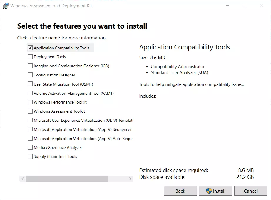 本指南将帮助你禁用Windows用户账户控制(UAC)提示,也就是"你要允许此应用对你的设备进行更改吗?",并将其设为例外,同时不影响系统的整体安全性。 获取工具 1. 你需要下载Windows评估和部署工具包(ADK)。 2. 运行下载的文件。 你可能会对1.7GB的大小感到担心,不过不用担心,因为你实际只需要大约8.6MB。