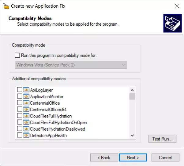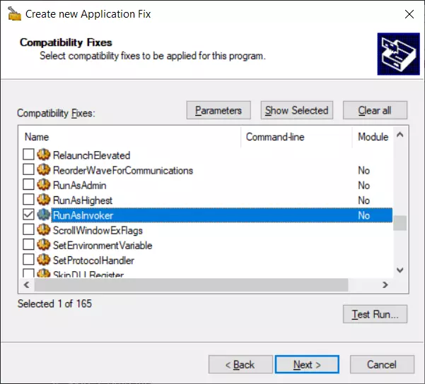 5. 在【兼容性修复】中 选择【RunAsInvoker】。 左下角应显示【已选择 1/165】。 点击【测试运行...】和【确定】,如果运行正常,Borderless Gaming 应用程序将无 UAC 提示启动,关闭 Borderless Gaming 并点击【下一步】继续。