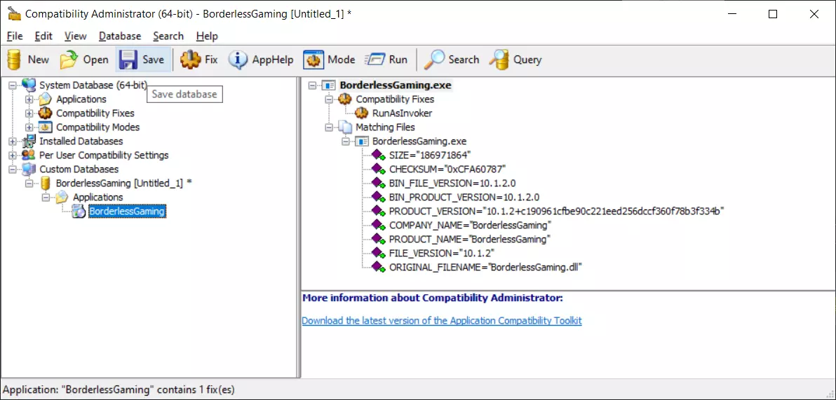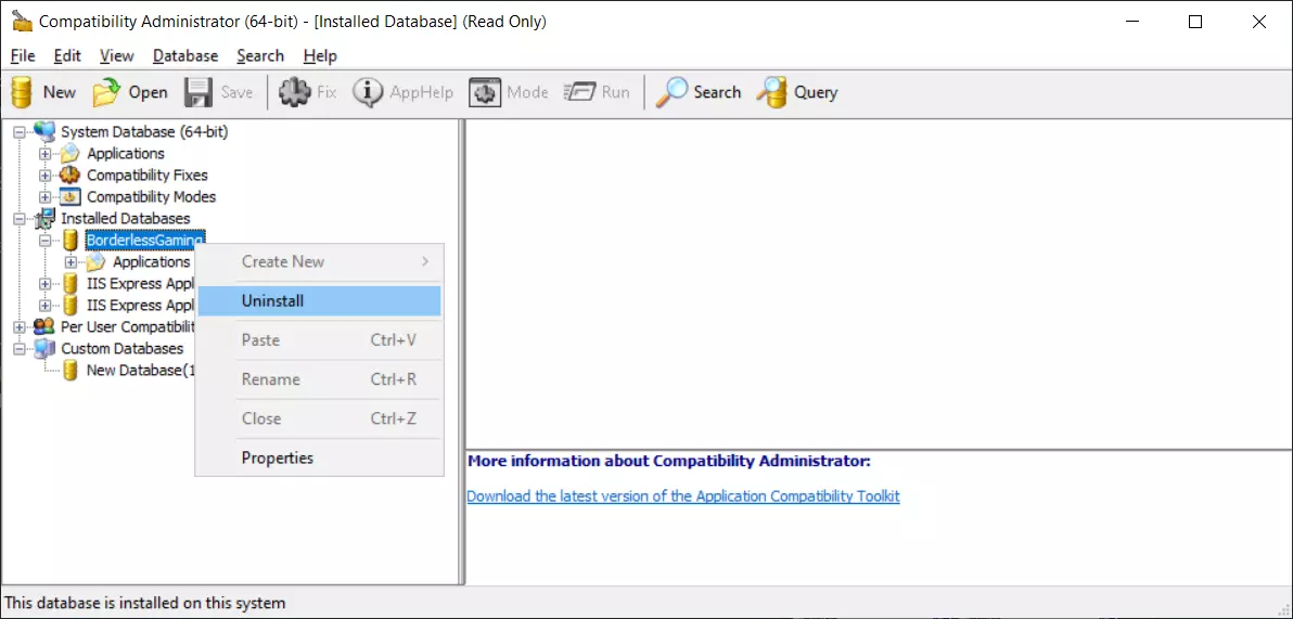 4. 确认用户账户控制弹窗,操作完成。 撤销例外设置 1. 打开兼容性管理员(64位)。 2. 展开“已安装数据库”。 3. 右键点击BorderlessGaming并选择“卸载”。 成功删除后会有弹窗提示。