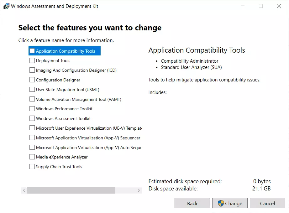 操作应该到此完成! 删除兼容性管理员 1. 打开“adksetup.exe”。 2. 选择“更改”并点击“继续”。 3. 取消勾选“应用程序兼容性管理员”,然后点击“更改”。