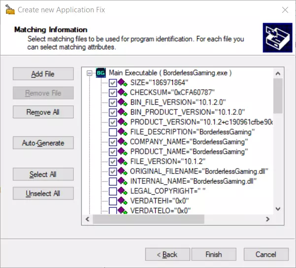 6. 复杂情况从这里开始。 如果你希望工具易于使用,且相信开发者会更新此应用,那么选择: 公司名称 产品名称 原始文件名 但如果你想更安全地防止可执行文件被潜在伪造,可以添加额外检查,例如: 大小 校验和 文件版本 等等。这会略微减慢启动速度,但影响不大。完成后点击“完成”。