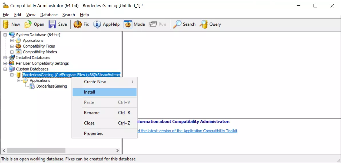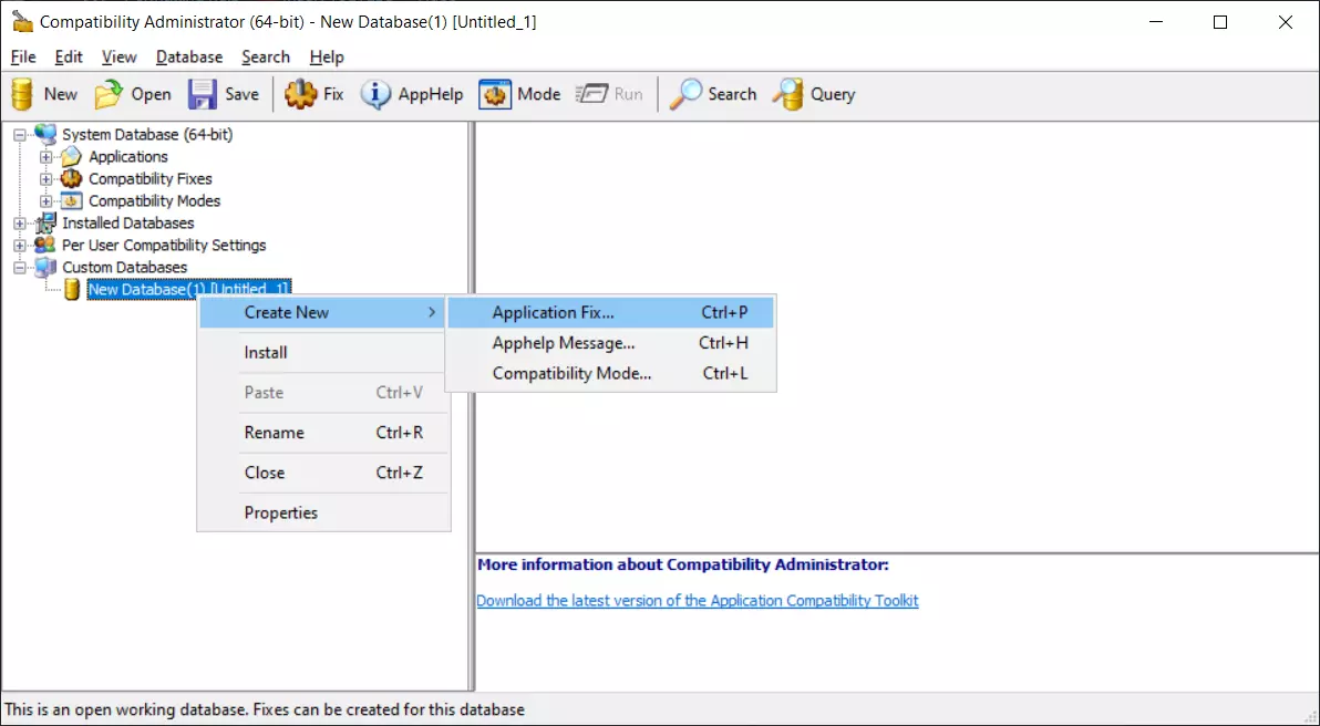 6. Windows会询问你“是否允许此应用程序...”,点击“是”。 7. 安装完成后点击“关闭”。 使用工具 现在开始菜单中应该有两个新程序: 兼容性管理员(32位) 兼容性管理员(64位) 1. 运行64位版本。 如果在开始菜单中找不到,它应该位于: C: ProgramData Microsoft Windows Start Menu Programs Windows Kits Windows ADK Application Compatibility Toolkit Developer and Tester Tools Compatibility Administrator (64-bit) 2. 右键点击“新建数据库...”,将鼠标悬停在“创建新项”上,然后选择“应用程序修复...” (新建数据库 > 创建新项 > 应用程序修复...)