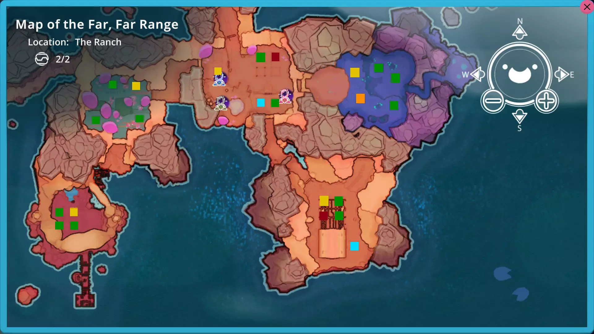 Legend: Yellow: Silo Green: Garden Red: Corral 1 Cyan: Corral 2 Orange: Incinerator The silos are closest to the plort market/entrance of the area for quick selling before the market link is available in all areas. 30+ Dervish Tangle largos free roaming in the Grotto (1 drone to carry some pears to the incinerator from time to time). Gardens grow prickle pear. The incinerator and the 5 - 8 Fire slimes are high up, so it’s less likely the largos would wander up there. No scareslime on the gardens for the free ranging areas. 1 drone can pick up one plort and the other go for the second type in the free ranging areas as it’s more difficult to pick the plorts up or you can automate the plort picking in this area with one drone only in case you have been unlucky with materials. The Grotto is the best on-site free range spot, so I kept it for these very costly plort makers, but you can keep other Dervish or the Quantum largos here instead for safety. 30+ Quantum Saber largos free roam in the Overgrowth. Gardens grow phase lemons. 30+ Mosaic Hunter largos (or Quantum Saber/Tangle/Mosaic) free roam in the Docks (They occasionally yeet themselves into the sea and the pond, but except with Dervish largos, this isn't a very big problem. Have source slimes' toys lying around to gather them and reduce this problem as well as improve their mood). 5 Puddle slimes stay in the pond (need rubber duck so they would make plort with a 5th member). Gardens here have silver parsnips. Hunter largos turn feral from time to time and attack you. You will need the taming bell or just feed them quickly or simply be very nimble. If you want to be safe, opt out from having free-ranging Hunter largos and just keep them in a corral in the starting area. Starting area has Phosphor Tabby largos in corral 1 and Honey Crystal largos in corral 2 (with Quantum/Dervish/Honey Hunter largos and their food in a third corral if you opt for it instead of free-ranging Hunter largos). Placement makes sure they are too far apart for the honey plorts to be targeted and make it unlikely for stray slimes to start a tarr outbreak. The Honey Crystal corral is closer to the plort market for easier direct sale as their price is higher. Both the ones here eat fruit for automation. You can switch their locations in case you favour the Phosphor Tabby near the entrance to the Lab for ease of Slime Science transportation and no need to be wary when rushing to the Lab. The gardens here have cuberries and mint mangoes (and the according third fruit if you opt to have Hunter largos here). The Lab has Pink Rock largos in corral 1, near the Refinery as you will need A LOT of pink plorts in the Refinery for Slime Science and the Rad Boom largos far at the back, unable to disturb anyone. Both the largos here favour veggies for automation. The gardens here will grow heartbeets and oca ocas. For the two non-free-roam areas, add a few of the according food to the automatic feeders first for the drones to follow. This arrangement allows you to keep the priciest plort producers in free roam making enough space for a lot of them (6 - 12 in corral vs. 30) while the less expensive plort makers remain around for Slime Science and collection. Total automation is possible. It will just be slightly dangerous to enter the free roaming areas as the high tier ones are also dangerous. Take a full tank of water when visiting the Mosaic largos to get rid of their glints. When you have unlocked Viktor's advanced drones which can do two tasks, you will still want 2 drones/area for efficiency with their stations near the entrance for ease of recharge and you want to upgrade the dock and the grotto first so the advanced drone can burn stuff for the Fire slimes AND pick up 1 type of free range plort (I personally put 2 advanced ones in the grotto so the drones won't ever pick up the same type of plort wasting time being inefficient). Same issue with the Docks so you can have 1 regular drone taking 1 plort and 1 advanced drone taking the other plort + puddle plorts. You will want two drones to sweep plorts in the free ranging areas, trust me. One drone won't be able to keep up with the largos and the precious plorts can despawn. This is what I theorise to be the ideal end game arrangement allowing you to maximise plort potential (unless the devs decide to release even more slime types, in which case this will have to be revised). However, this is just my favoured arrangement and what I see as ideal, it’s up to you if you want to try this. You can mix and match on your own based on your preferences, but I still recommend sticking to the rules listed out to make your life easier. Leave a comment if you think there is a better arrangement and I will check it out. I will revise and credit accordingly. The end Congratulations on finishing this guide. It was nearly 3000 words, I can't even believe it myself. General rules: Raise vegetarian largos Largos in one area must have same diet (all fruit or all veggies) Mix nonviable slimes with viable ones for viable largos Slimes with viable diets: Rock, Phosphor, Rad, Honey, Quantum, Mosaic, Dervish Slimes with nonviable diets: Pink, Tabby, Boom, Crystal, Saber, Hunter, Tangle If you have any problems following this guide or using my arrangements, leave a comment and I will see if I can address the issue. There is room for more mix and match, this is just my theory.