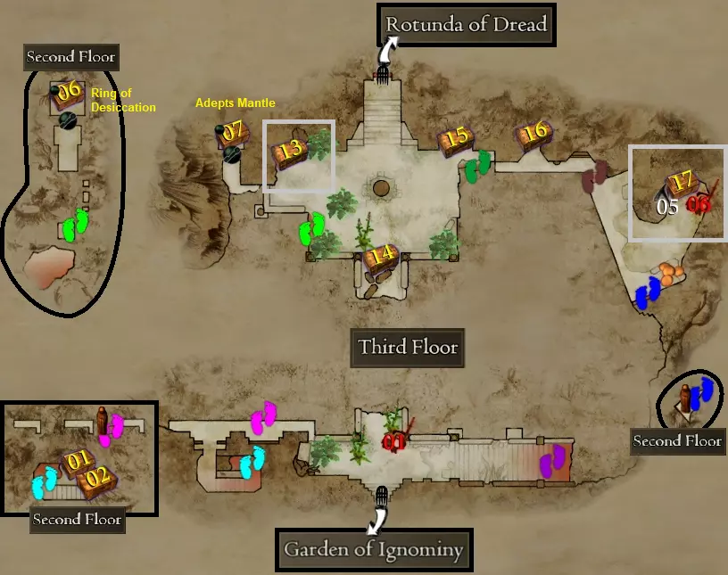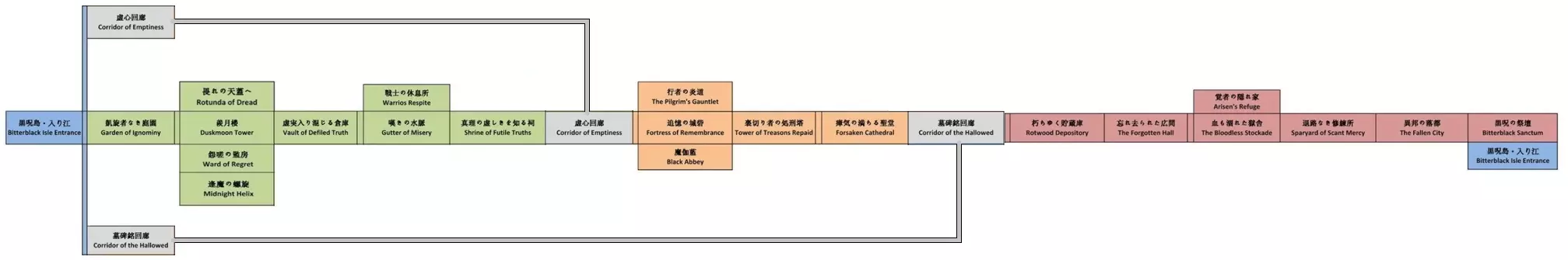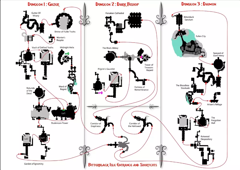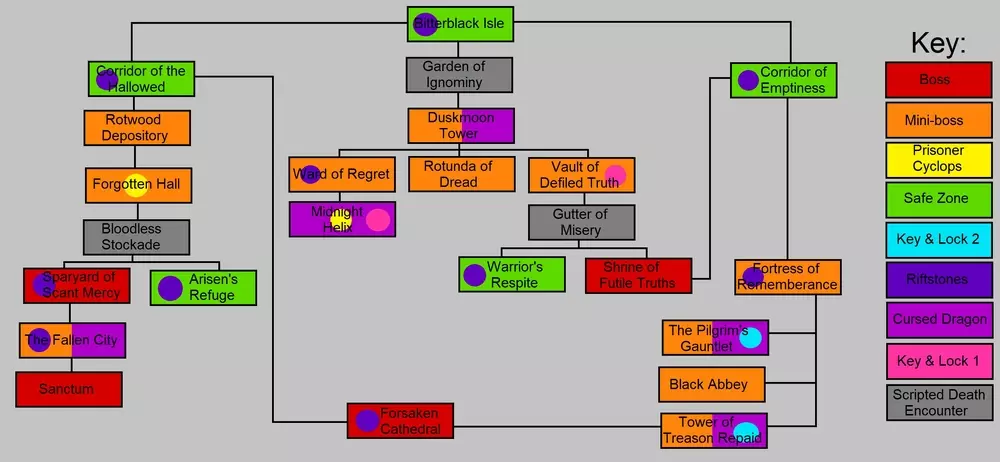 本指南旨在提供详尽的黑咒岛地图及流程攻略,同时解释击败大龙前后的关键差异。此外,还包含了可遭遇的主要 Boss 汇总,以帮助玩家更高效地刷经验并达到 200 级,助力玩家在这座充满挑战的岛屿中优化进度。 总览地图 这座复杂的地牢分为多个相互连接的区域,很容易在其房间内迷路。为了帮助你导航,我们首先会展示一张标有路线的示意图,让你了解房间之间的连接方式,以便快速高效地到达目的地。之后,我们将详细解析每个房间。击败【大恶魔】后,相同区域会重新刷新更强的敌人和升级后的宝箱。 地点日程