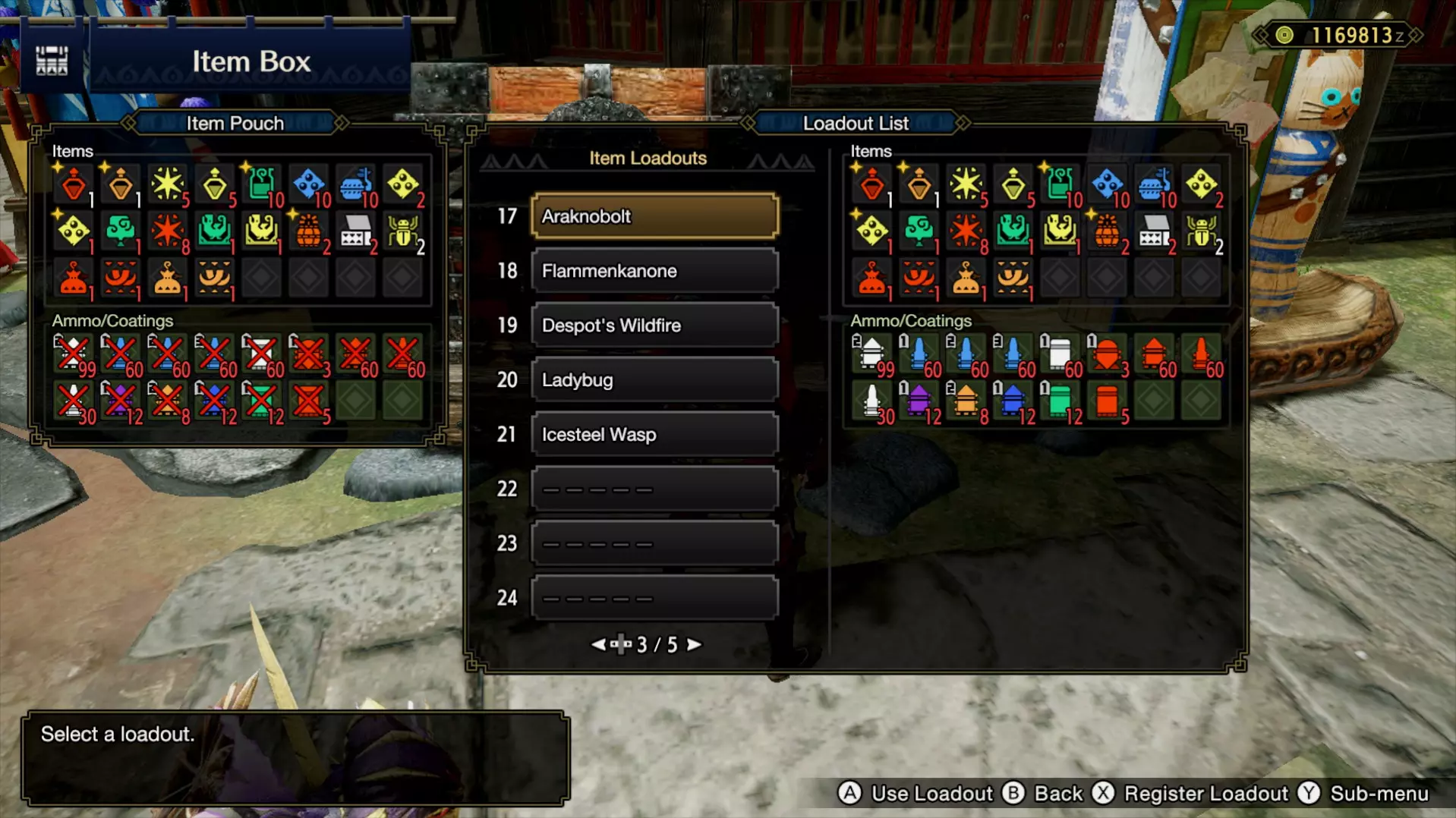 在我个人看来,第4到7行的内容是标准的【必备事项】。这些基本上是自动完成的支线任务,无需刻意去完成。作为第五个支线任务,我建议选择能快速完成的,或者你确定无论如何都会去做的事情。比如尽可能收集蜂蜜,因为你知道它经常用于制作大回复药。 关于村云点数:在某些时候,你可能会觉得收集更多的点数似乎毫无意义。 然而,人们往往忽略了可以通过将点数兑换成物品——尤其是可兑换大量zeni的【交换物品】——轻松将点数转化为zeni。 此外,这些点数还有助于兑换必要的制作材料,以获取多种【强化道具】。如果你想了解更多关于强化物品的信息,可以查看相关指南。 2. 刷新你的物品配置 补充药水、陷阱和炸弹可能是一项耗时的工作——但如果你能充分利用物品配置功能就不一样了!设置多个物品配置不仅能让你的操作更轻松,还能在狩猎间隙节省大量时间。 老手提示:你不仅可以将快捷轮盘配置与物品配置关联,还能按照自己最习惯的顺序在快捷栏中排列物品!