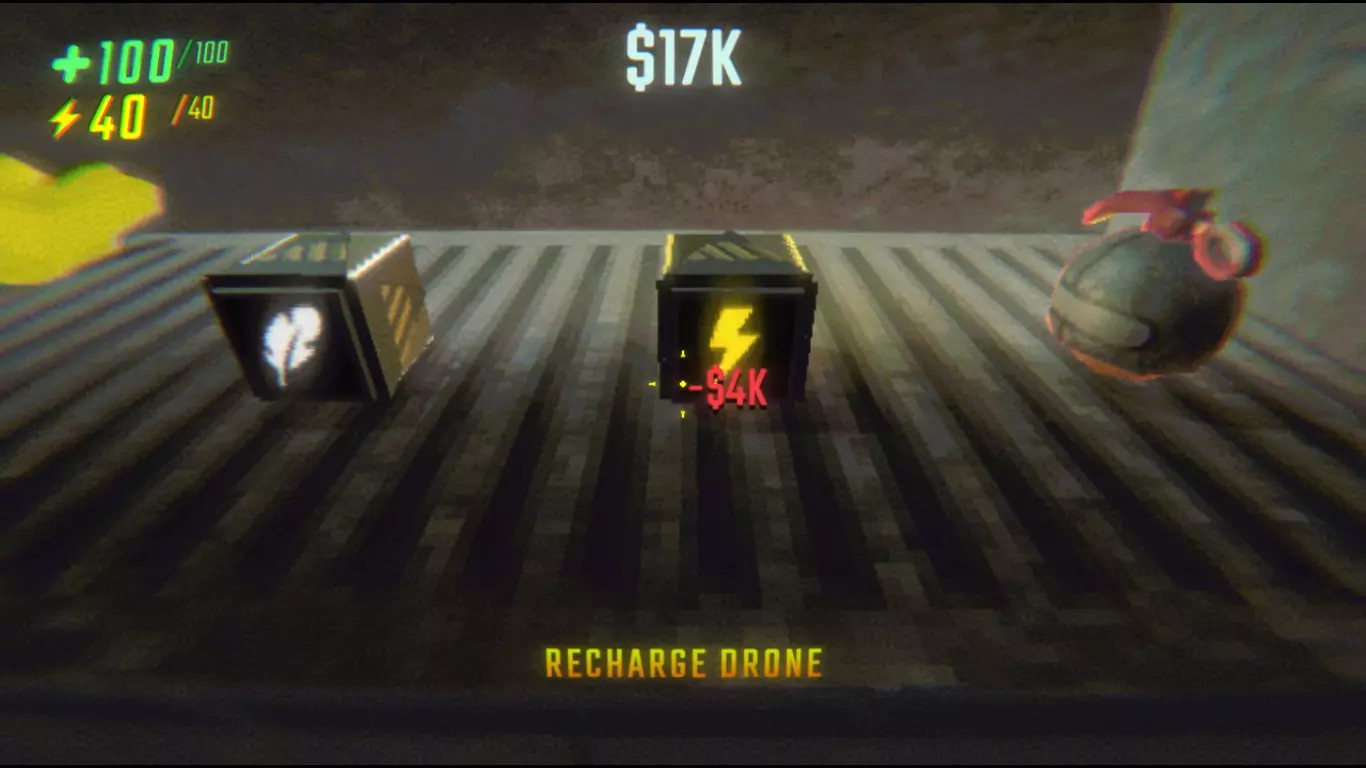 如果你使用任何武器或无人机,最重要的是购买一块水晶,因为它可以完全充能任何物品。水晶在耗尽所有能量后会损坏。即使你不购买,你的飞船/卡车里也总会有一块。 无人机 每架无人机都有不同的功能,并通过颜色和显示的图像来区分。和武器一样,无人机也会消耗能量并占用背包空间。 Recharge drone