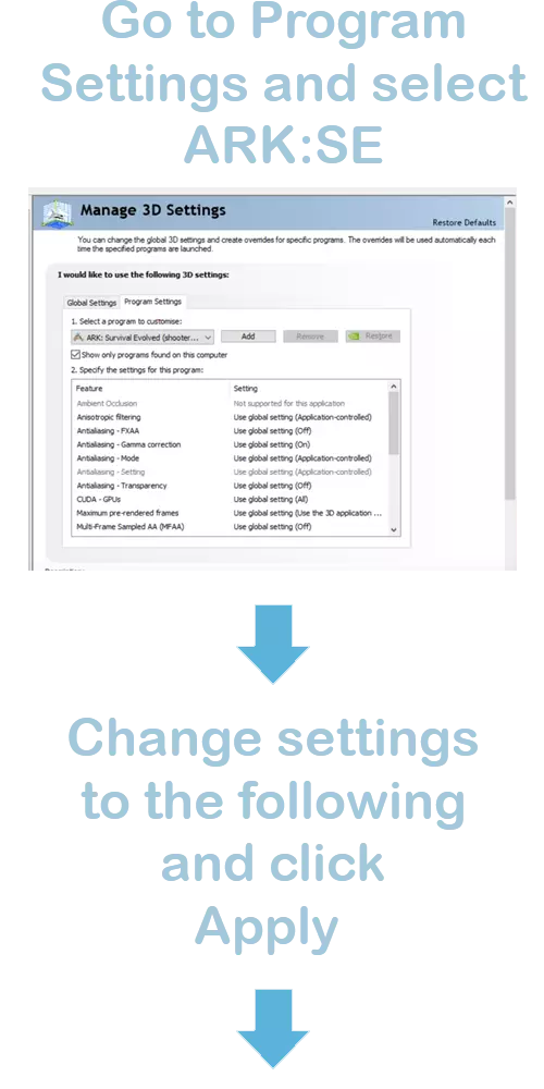 在以下输入框中粘贴这些启动项并点击确定: -USEALLAVAILABLECORES -sm4 -d3d10 -nomansky -lowmemory -high 所有实用启动项及其说明列表: -USEALLAVAILABLECORES -(游戏将使用你所有的CPU核心) -sm4 和 -d3d10 -(以DirectX 10模式运行游戏) -nomansky -(移除云层和部分天空效果) -lowmemory -(游戏仅使用4GB内存) -w 640 -h 480 -(以640x480分辨率运行游戏) -full -(全屏模式) -window -(带边框窗口模式) -noborder -(无边框窗口模式) -low -(以低优先级进程运行方舟) -high -(以高优先级进程运行方舟) -noaafonts -(移除字体抗锯齿) -autoconfig -(恢复默认设置)NVIDIA 设置