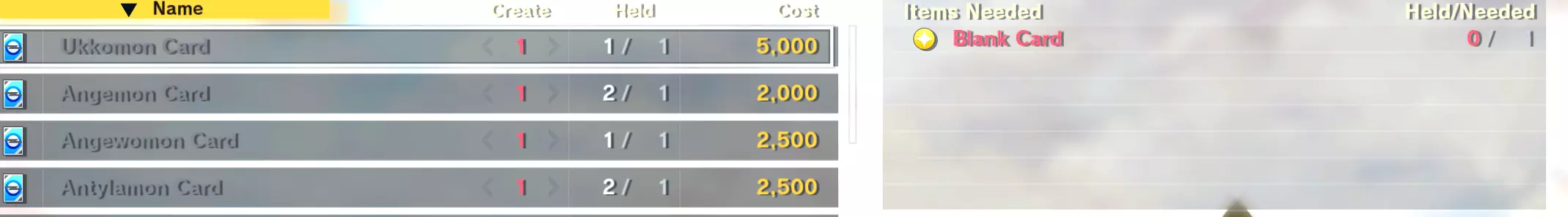 Card Price No. Agunimon Card 3500 187 Alphamon Card 4300 308 Alphamon: Ouryken Card 4500 427 AncientWisemon Card 2900 372 Astamon Card 2400 265 Bacchusmon Card 3600 389 Bacchusmon DM Card 3800 390 Barbamon Card 4300 391 BeelStarmon Card 4400 400 Beelzemon BM Card 5000 444 Beelzemon Card 4800 401 Belphemon RM Card 4600 445 Belphemon SM Card 3800 402 Boltmon Card 1800 362 Ceresmon Card 3000 348 Ceresmon Medium Card 3600 349 ChaosGallantmon Card 4200 374 Chaosmon Card 4000 432 Coelamon Card 2200 122 Craniamon + Enbarrmon Card 4850 428 Craniamon Card 4300 316 Creepymon Card 3900 387 Datamon Card 1550 285 Dokugumon Card 1350 158 Dynasmon Card 4200 355 Etemon Card 2400 268 Examon Card 3900 439 Gallantmon CM Card 4300 433 Gallantmon Card 4150 388 Gankoomon Card 4200 344 Garudamon Card 1800 204 GoldNumemon Card 1600 150 GraceNovamon Card 4100 434 Gryphonmon Card 2800 347 Guilmon Card 1110 64 Imperialdramon DM Card 3300 416 Imperialdramon FM Card 4050 417 Imperialdramon PM Card 4400 429 Jesmon Card 3900 352 Junomon Card 3800 410 Jupitermon Card 5000 340 Jupitermon WM Card 5000 437 Kentaurosmon Card 4000 326 Kimeramon Card 2700 235 Koromon Card 950 9 Kuzuhamon Card 2600 345 Lalamon Card 1500 56 Leomon Card 1400 109 Leopardmon Card 4000 356 Leviamon Card 4200 413 Lilithmon Card 4600 414 LoaderLeomon Card 2000 228 LordKnightmon Card 4050 415 Lotosmon Card 3400 368 Lucemon CM Card 4800 296 Lucemon Card 4800 39 Lucemon SM Card 5000 447 Machinedramon Card 3100 406 Magnamon Card 3500 423 MaloMyotismon Card 2700 399 MarineAngemon Card 3500 328 Mastemon Card 3700 337 Merukimon Card 3100 409 Mervamon Card 3900 446 MetalEtemon Card 2100 408 MetalGarurumon Card 3900 364 Minervamon Card 3800 404 MirageGaogamon BM Card 4950 440 Mistymon Card 3400 292 Monochromon Card 1700 136 Muchomon Card 1600 55 Mummymon Card 1600 291 Neptunemon Card 3300 331 Omnimon Card 4000 430 Ophanimon Card 4100 314 Pandamon Card 2300 250 Plutomon Card 3700 397 Puppetmon Card 3600 393 Rapidmon (Armor) Card 3950 422 Rosemon Card 3200 367 Salamon Card 1000 34 Seraphimon Card 2500 328 Akihabara: A Certain Back Alley 2 (The shop is so big I've had to split this into 2 due to character limit) Card Price No. ShineGreymon BM Card 4100 435 Sirenmon Card 2600 241 Titanmon + SkullBaluchimon Card 5100 442 Susanomon Card 3800 436 Syakomon Card 1300 67 UlforceVeedramon Card 4250 309 Veemon Card 1250 77 Vegiemon Card 1400 167 Venusmon Card 3700 311 WarGreymon Card 4200 312 In total: 92 Cards. The shop is the same 8 years ago Central Town: Downtown