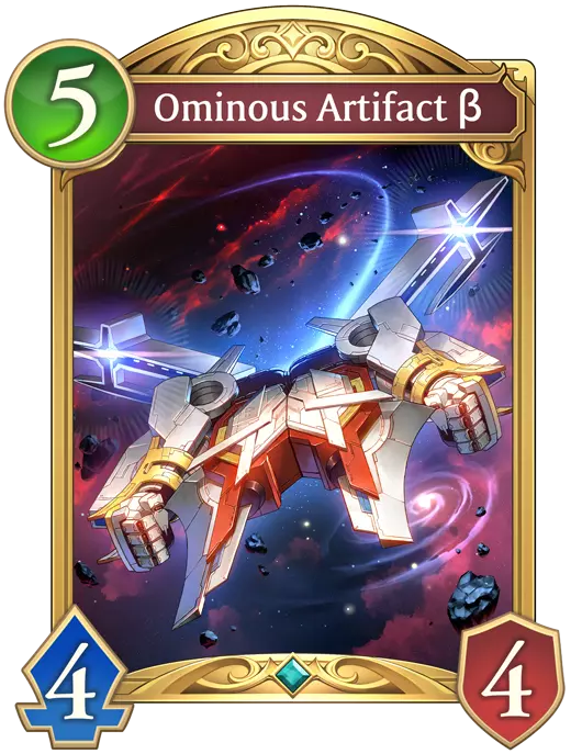 神器开始变得更加精致,并拥有不同的能力。 将1阶神器与总费用达到特定数值的不同卡牌材料融合,可将其转化为相应的2阶神器。 2阶神器是费用为5、具有神器卡牌特性的随从类型卡牌。无论使用的1阶基础神器是攻击型还是防御型,其合成配方都相同。 【不祥神器α(阿尔法)】是一张5费随从牌,当它在场上时,在你的每个回合结束时为你的领袖恢复3点生命值。 阿尔法是通过将1阶神器与一张或多张总费用等于1的材料融合而创造的。 由于你只能使用神器作为其他神器的融合材料,制作阿尔法最具成本效益的材料是任意一种单独的0阶消耗型神器。不祥神器β(测试版)是一张5费的随从牌,当它在场上时,在你的每个回合结束阶段对敌方首领造成3点伤害。 β通过将1阶神器与一个或多个总费用为2的材料融合来制作。 制作β最具成本效益的材料是任意组合的两个0阶消耗型神器(没有单张费用为2的神器卡牌)。需要注意的是,【Beta】的合成材料在所有2阶神器中占用的手牌空间最大,因为适合合成它的材料只有两张0阶素材卡;游戏中确实没有其他任何神器卡牌组合能达到2费,因此值得优先考虑合成这件神器,因为在对战后期手牌数量会受到限制,这使得这件神器相比其他神器更难合成。 【Ominous Artifact γ(Gamma)】是一张5费的随从小怪,当它在场上时,在你的每个回合结束阶段,会对所有敌方随从小怪造成3点伤害。 【Gamma】通过将1阶神器与一张或多张总费用为3或更高的材料融合来合成。制作伽马(Gamma)最具性价比的材料是任何1阶神器,它可以通过将两个0阶 fodder 材料简单组合即时制作出来。不要浪费3个 fodder,因为2个组合在一起效果同样好。 通常,你需要努力在手中各持有一张2阶神器卡牌,以便在游戏后期能够制作终极神器。 在考虑优先制作哪种2阶神器时,要根据当前对战中每种神器独特能力的紧急程度来决定。在决定制作顺序时,考虑你是否需要治疗、领袖伤害或群体清场能力。 终极神器