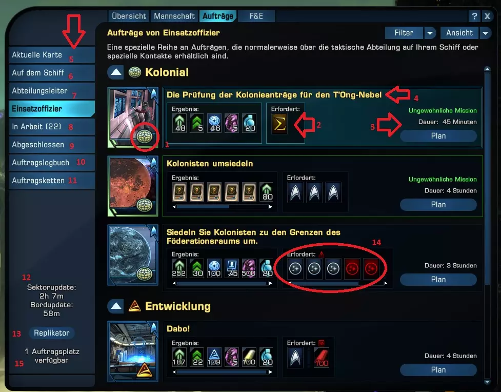 现在每个任务都有基本要求,例如特定职业(专精),如:心理学家、物品、商品或特定角色特征。只有满足这些要求,才能开始任务。 你可以在舰桥军官菜单中打开任务。在那里,你会找到一个随机生成的任务列表,这些任务来自相应的地点或区域。请注意,这些任务会不时变化,具体可查看左下角的计时器。此外,部分已完成的任务有冷却时间,无法立即重新开始,也不会显示。同一任务在同一时间只能进行一次,因此在其他区域也根本不可用。关于各个区域,存在一些特殊情况,我们将在本指南的后续部分为大家介绍。重要的是,你们只需选择对自己有利可图的任务。当你们开始一项任务时,既能看到其基本要求,也能了解成功完成后可能获得的收益。