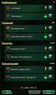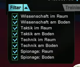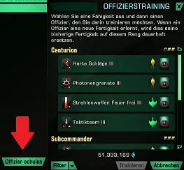 科学 太空 科学 地面 技术 太空 技术 地面 战术 太空 战术 地面 间谍 太空 间谍 地面 通过点击开头的复选框,你可以分别选择所需的技能。 通过你的角色进行训练 每个角色都可以独立训练个人技能,这些技能通过你自己分配点数获得。在角色窗口中,你可以在【军官训练】下找到此功能(见红色箭头)