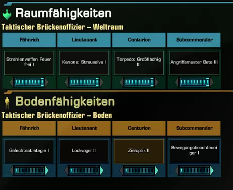 5.1(多夫)现役任务 5.2(多夫)招募 5.3(多夫)任务链 效率的关键6:舰桥军官 处理中 初步介绍 每位舰桥军官拥有4项地面技能和4项太空技能。这些技能可通过熟练度提升等级,从而缩短冷却时间并增强效果。 太空技能是你日后可以亲自使用的技能,仅在你的飞船上生效。舰桥军官的地面技能可以自动施放,也可以手动施放。舰桥军官仅能在地面章节任务中使用,在STF中无法使用。