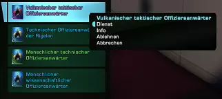 其中一些任务完成后会提供可重复的任务,完成后可再次获得稀有或非常稀有的舰桥军官(DOFF)。其他任务链分布在《星际迷航Online》宇宙的整个地图中,并会时不时出现在可选的舰桥军官任务中。如果成功完成许多任务并获得足够的功勋点数,某个类别就会提升一个等级,届时费拉中尉会向你提供一名非凡的舰桥军官。在后续等级中,你会从他那里获得更好的舰桥军官,并可以从他提供的选项中选择一名。其余的舰桥军官也可以在学院向他用迪利姆币购买,但考虑到价格较高,不太推荐这样做。相反,星际舰队学院也提供经济实惠的替代方案来充实其尉官队伍。
