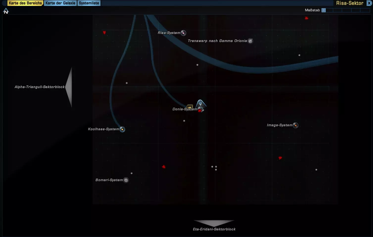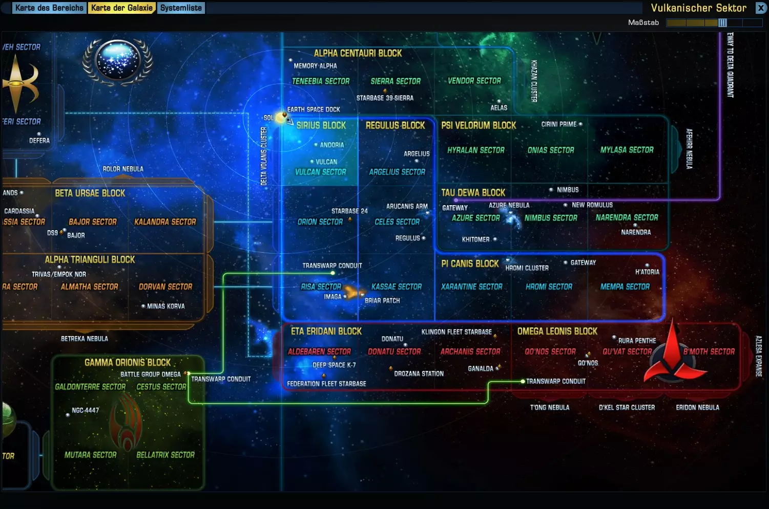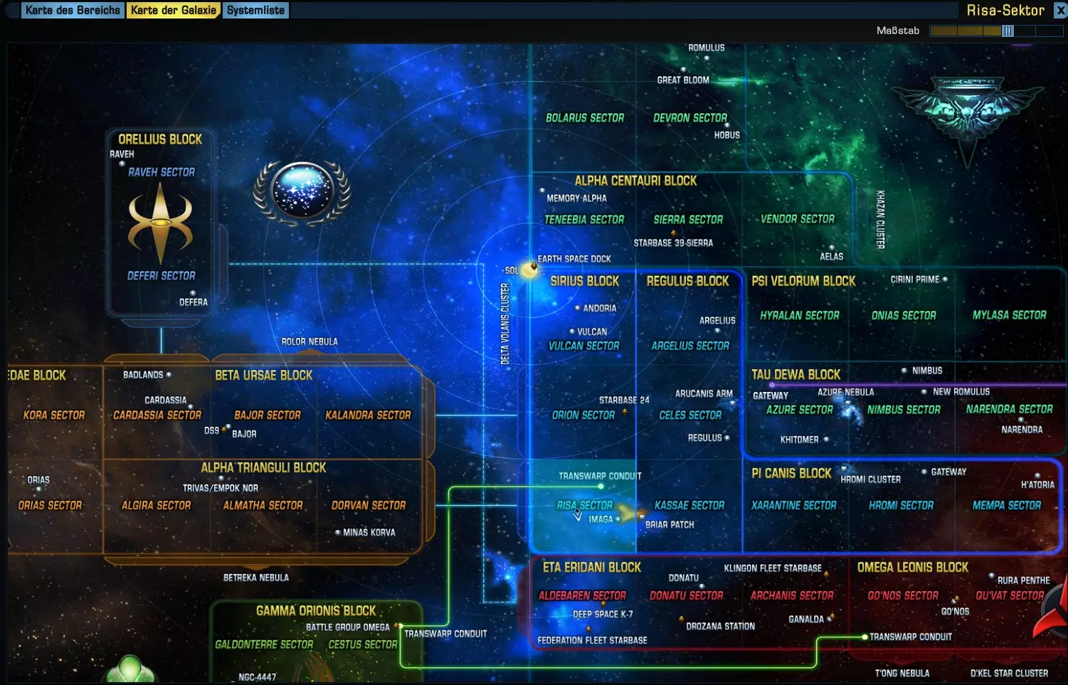 明亮区域“瓦肯星区”是我们当前所在的位置,那个小箭头就是我们。现在我们想要前往南方的“里萨星区”。我们所在的“天狼星区块”共有3个星区。现在我们回到“区域地图”,拖动地图直到到达底部。在那里选择一个星系,例如“多尼亚星系”,点击它,然后飞船就会设定前往该星系的航线,并朝着区块南端飞去。 到达底部后,我们再次打开“银河地图”,就能看到以下内容。