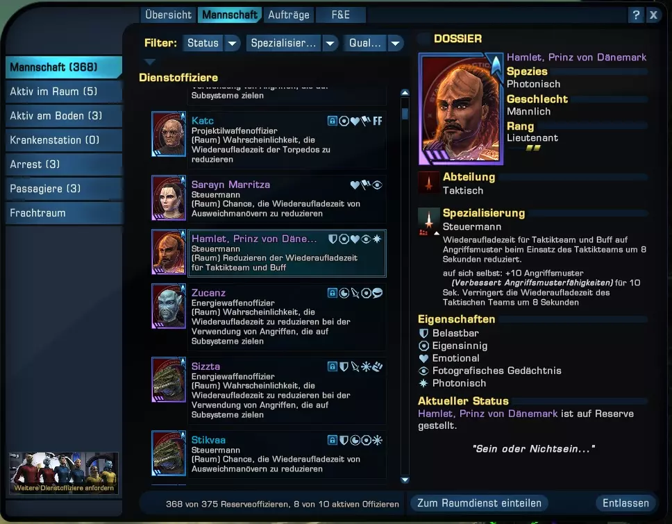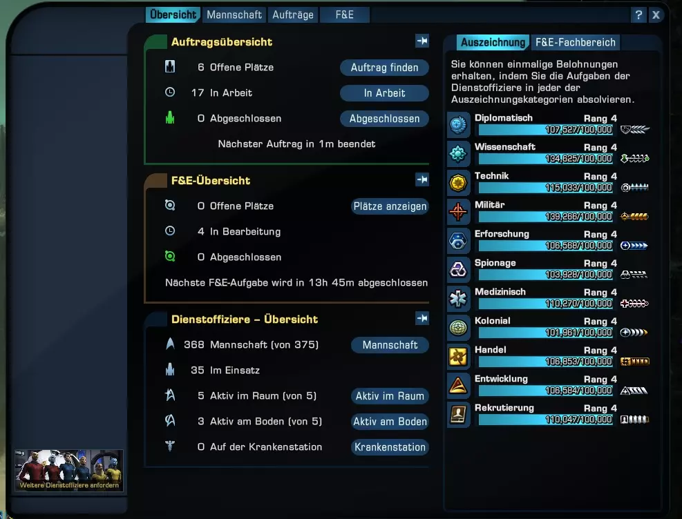 现在,一旦选择了敌人且敌人在射程范围内,他就会自动射击。 效率的关键5:多夫(服务军官)系统 服务军官,简称多夫,是我们想向大家介绍的另一项功能。他们让你在战斗间隙能进一步感受《星际迷航》的氛围,同时还能提供高效的奖励。 何时会有DOFF任务? 当你达到11级时,会收到可以开始服务军官任务的通知,并会获得一个包含若干名DOFF的箱子。打开箱子后,会出现一个列表窗口。此时你就进入了DOFF菜单。 如何以其他方式进入该菜单?在小地图正下方(大多数情况下位于屏幕右上角)有一些图标。选择带有三个头像的图标(两个商店按钮的右侧) 提示:对于所有喜欢舰桥军官的玩家,将其在HUD中设置为快捷键会很有帮助。 舰桥军官菜单包含以下部分: 概览、船员、任务以及研发 舰桥军官是继舰桥军官(BOFF)之后的第二梯队船员。 和游戏中的其他物品一样,他们目前也分为不同的品质等级,但无法进行强化。因此,这里也有: 白色(普通)、绿色(不寻常)、蓝色(稀有)、紫色(非常稀有)以及金色(史诗)舰桥军官。除了外貌和种族(种族的作用相对次要)外,每个角色都有不同的性格特质,数量在1-6个之间。例如,瓦肯人、泰拉人、安多利亚人或人类通常都具有【联邦创始成员】这一特质。 除了这些特质外,角色的专长及其所属部门起着更重要的作用。 部门包括: 战术 安全 行动 技术 医疗 科学 民用 在船员界面中,你可以查看当前团队,并可按状态、专长和品质进行筛选。