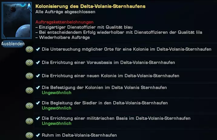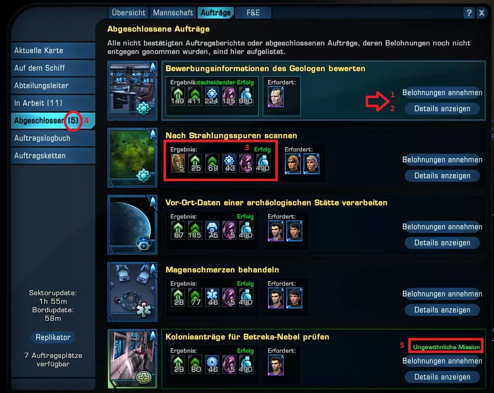 [1:领取任务奖励,2:查看任务详情(再次显示任务的所有概览),3:任务结果及收益,4:已完成任务数量,5:任务稀有度(稀有度越高收益越高)] 每个任务根据DOFF任务的难度不同,会产生不同的影响。 这些影响在任务开始时可以查看。品质更高的DOFF,如蓝色或紫色(非常稀有),会带来更高的任务成功概率。 所有任务都有不同的持续时间,同一任务的持续时间始终固定且无法缩短。因此,超过20小时的任务只适合不常在线的玩家。如果在一个星区找不到足够合适的任务,就前往下一个星区。建议多在几个星区搜寻,以便找到一组优质任务,从而在单位时间内获得最佳成果。 除了星区任务外,还有与舰船相关的独立任务。这类任务中有许多能为舰船系统提供限时增益。 第三类是部门主管任务。这是另一个任务池,其任务来源于星区相关任务和独立任务,为你提供更多选择。 你的舰桥军官成功完成任务后,将获得经验值,此外还会在任务所属的类别中获得额外奖励,例如探索或殖民,获得声望点数。迷雾还能让你开启任务链。任务链最终能让你有机会获得特殊军官或物品。这类任务的识别方式是任务名称后会标注数字(1/7)。