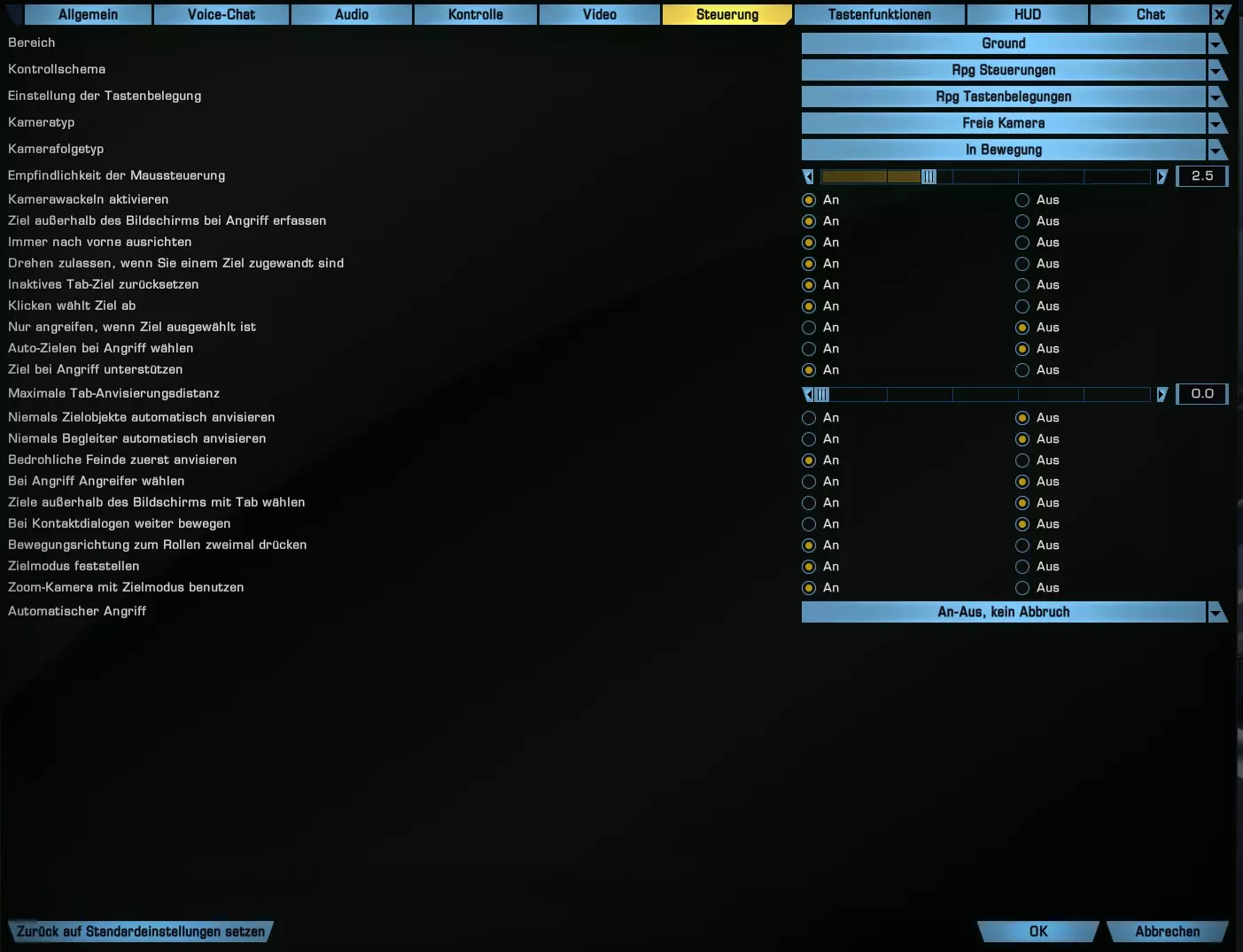 现在,当选择了敌人且敌人在射程内时,角色会自动射击。 效率的关键4:地面自动射击 自动射击! 什么,你们不知道?这也难怪,游戏里几乎没提到过这个功能。 关于地面自动射击,有几点需要注意: 1) 自动射击仅在地面战斗的RPG操控模式下生效。 2) 极少数武器适合将第二次射击设为自动! 接下来我会告诉你们如何激活并使用这个关键功能! 进入选项,然后点击操控,你们应该会看到下图所示的界面。如果你们的界面不同,请将区域切换为“Ground”(地面),因为你们很可能正处于太空的某个位置。