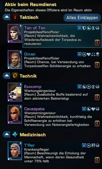 Star Trek Online ist, wenn man erst mal die Grundstruktur erkannt hat, ein sehr Umfangreiches und vor allem Abwechslungsreiches Sci-Fi MMO, mit einem tollen Raum und Bodenkampf! Doch STO (Star Trek Online) macht es gerade Anfängern nicht einfach das Spiel in den ersten Stunden zu mögen, viele Schlüsselfunktionen und Eigenheiten werden nur wenig bis gar nicht erklärt und so trottet der vermeintlich sich durch das Tutorial gekämpfte Spieler durchs ALL immer mit dem Gedanken. „Warum soll das so toll sein?“ Aus meiner Erfahrung von etlichen Grundlagenvermittlungen, werde ich beginnen diesen Guide für alle jene zu Schreiben, die ratlos im Raum herumtreiben und keine Hilfe bekommen! Guideteam: - SWAYLER - Diomedes - Benkano Wir bedanke uns bei allen für eure Hilfe. Ich (SWAYLER) danke für die reichlichen Aufrufe die zeigen das der Guide in die richtige Richtung geht. Copyright: Der Inhalt, sowohl Text und Bildmaterial sind geistiges Eigentum der Autoren und dürfen nur auf Anfrage weitergegen, verarbeitet oder anderweitig Verwendet werden. Verlauf: V.1.1 -Einleitung -Grundlegende Waffenkunde inkl. Schadensarten bis Frage 6 -Schlüssel zur Effizienz 2 und 3 V.1.2 -Schlüssel zur Effizienz neu Nummeriert -Schlüssel zur Effizienz "Kartennavigation" hinzugefügt V.1.3 -Schlüssel zur Effizienz "wichtige Tastenfunktionen" hinzugefügt -"Allgemeine Tipps" hinzugefügt -Guideteam hinzugefügt -Copyright V.1.4 -Schlüssel zur Effizienz "Doff System" hinzugefügt Einleitung und Vorwort Wozu dient der Guide? STO bietet viele und entscheidende Funktionen, die so nicht oder nur unzureichend erklärt werden, für viele sind diese Funktionen aber essenziell um effizient und mit Motivation weiter zu spielen. Dieser Guide möchte Reibungspunkte im Spiel abbauen und mehr spaß am Spiel erzeugen. Was wird der Guide nicht tun! STO ist Umfangreich, viele aspekte werden hier nicht besprochen sondern werden im Verlauf des spieles auch selbst erklärt. Teile wie das DOFF und RUF System oder Tauschbörse werden hier zumindest in der ersten Reversion nicht geklärt! Auch dient der Guide nicht euch ein möglichst gutes Setting vorzu setzten, es gibt lediglich eine Einstiegshilfe in STO so das ihr mit einer Soliden Basis anfangen könnt! Grundlegende Waffenkunde! 1.Frage: Was für Waffen gibt es welche sollte man nutzen? Antwort: Auflistung der Schadenarten Energiewaffen: Phaser: 2.5% Chance ein zufälliges Subsystem (Waffen, Schilde oder Antrieb) zu deaktivieren Disruptor: 2.5% Chance die Schadensresitenz des Ziels für 15 Sekunden um 10% zu senken Plasma: 2.5% Chance einen nicht stapelbaren Schaden auf Zeit ("DoT") auszulösen Polaron: 2.5% Chance die Energie aller Subsysteme um 25 zu reduzieren Tetryon: 2.5% Chance zusätzlichen Schildschaden zu verursachen Antiproton: 2% Chance einen kritischen Treffer zu landen, gesteigerte Schwere des kritischen TreffersZu Einstieg ins Spiel empfielt sich seine Vorlieben kenn zu lernen und danach zu entscheiden. Sollte man auf eine solide Grundlage stehen ist Disruptor die beste Wahl. Bei bevorzugtem Schildschaden ist eher Tetyron die richtige Wahl. Der Rest der Schadenarten hat auch ihren Vorteil, ist allerdings am Anfang nicht so leicht zu spielen, da diese durch Set etc. verstärkt werden müssen bzw. auch die richtig Brückoffizierfähigkeiten benötigen. Zusammenfassend: Am Anfang lieber auf Tetyron oder Disruptor gehen, damit macht ihr nichts flasch. 2. Frage: Sollte ich mehrere Waffenarten kombinieren? Antwort: Die Frage beantworten sich ganz leicht indem man zunächst sich die taktischen Konsolen anguckt. Es gibt Konsolen die denn Energieschaden einer Gattung erhöhen. Wenn man nun diese Konsole in alle taktischen Slots packt erhöht man seine Grundschaden der Waffengattung um das maximun. Die taktischen Konsolen die Strahlen- bzw. Kanonenwaffenschaden erhöhen können denn Grundschaden nicht so hoch bekommen wie ein gezielt auf eine Waffengattung ausgelegt Konsole. Abschließend ist die Antwort: Nur eine Waffengattung auf das Schiff 4. Frage: Was ist mit Schadenskonsolen für Projektilwaffen (Torpedos)? Antwort Eine Torpedo hat eine höhrer Nachladephase als Beam´s und Kanonen. Durch die Erhöhung von dem Torpedoschaden geht euch sehr viel an dem Grundschaden der Energiewaffen verloren. Euer Ziel sollte es sein, denn Energieschaden immer so hoch wie möglich zu bekommen und somit fallen diese Konsolen weg, sonst raubt ihr euch den Vorteil. Der Torpedo sollte nur als Unterstützung für die Energiewaffen auf dem Schiff sein. 5. Frage: Wieso mach ich dan nicht alles mit Torpedowerfer voll? Antwort Weil Cryptic mehrere Torpedowerfer die Cooldown zeit nicht nebeneinander ablaufen läßt sondern, die Cooldown zeit sich Stappelt, außerdem sind Torpedos teils sehr speziel und machen zum Teil keinen sinn ohne eine entsprechende Energiewaffen. 6. Frage: Beams oder Kanonen? Antworten *Grundlagenkiste aufmach* So was haben wir hier. Eskorten sollten Kanonen benutzen Kreuzer sollten Beams benutzen Natürlich ist nicht ganz so einfach es gehen viel kombinationen, für den anfang sollte man aber durchgehend NUR Kanonen oder NUR Beams benutzt werden. 6.2 Frage: Kann mich nicht entscheiden, was nun? Beobachtet wie ihr zum Gegner fliegt, stellt ihr euch eher seitlich zum Gegner? Oder stellt ihr euch frontal zum Gegner, nach dem Faktor solltet ihr eure Waffen wählen! Beispiel1. Ihr fliegt gerne seitwärts: Nun dann richtet eure Schiff danach aus. Seitwärts sollte vorranig Kreuzer sein da diese ersten mehr Waffenslots haben als Eskorten und zweitens diese weniger wendig sind. Also betrachtet man die meisten Kreuzer die es in dem Spiel gibt haben diese meist ein 4 Frontwaffen und 4 Heckwaffen. Um ein perfektes seitlich Setting zu haben ist die Benutzung von 250 grad Beams erforderlich. Stellt sich die Frage wie viel. Ihr sollte immer ei Blick auf die Waffenenergie haben. 8 Beams entziehen euch sehr viel Energie, ihr sollte also weniger Benutzen und ein Torpedo mit auf das Sc