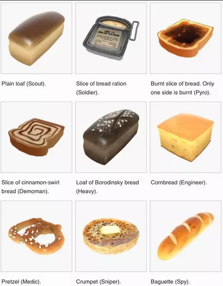 2014年6月11日,《军团要塞2》加入了传送时生成面包的机制。大多数玩家传送出来时面包生成概率为1/20,而士兵传送出来时概率为1/3。目前已发现九种不同模型的面包,下文将逐一介绍每种面包的详情,并按照其在近距离攻击/处决中的表现从最差到最佳进行排名。