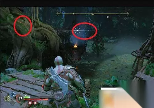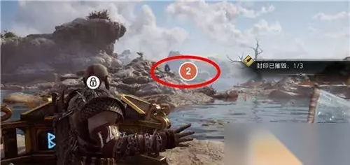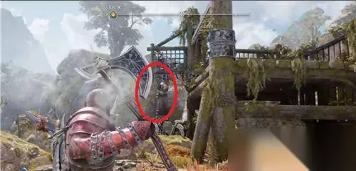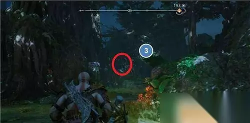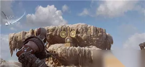 第三个在远处,需要用斧子攻击木牌,让木牌旋转起来,然后撞击装置。打开三女神宝箱获得【伊登的苹果】。