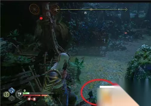 第三个装置比较远,点荆棘的位置在红圈处,打开三女神宝箱获得【伊登的苹果】。