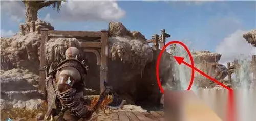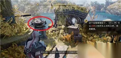 第三个要用斧头冻住宝箱正对着的喷泉(下图所示),然后利用混沌之刃跳到台子上(需要从右侧跳上去)。