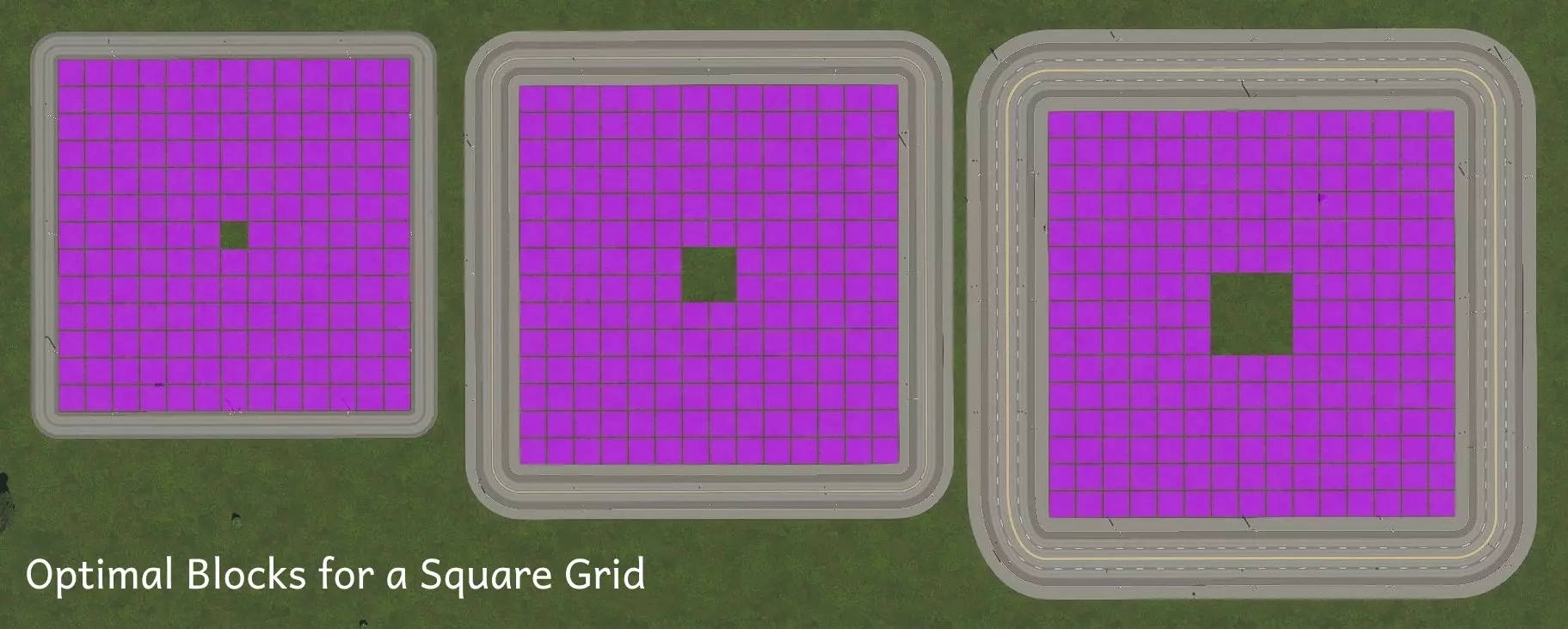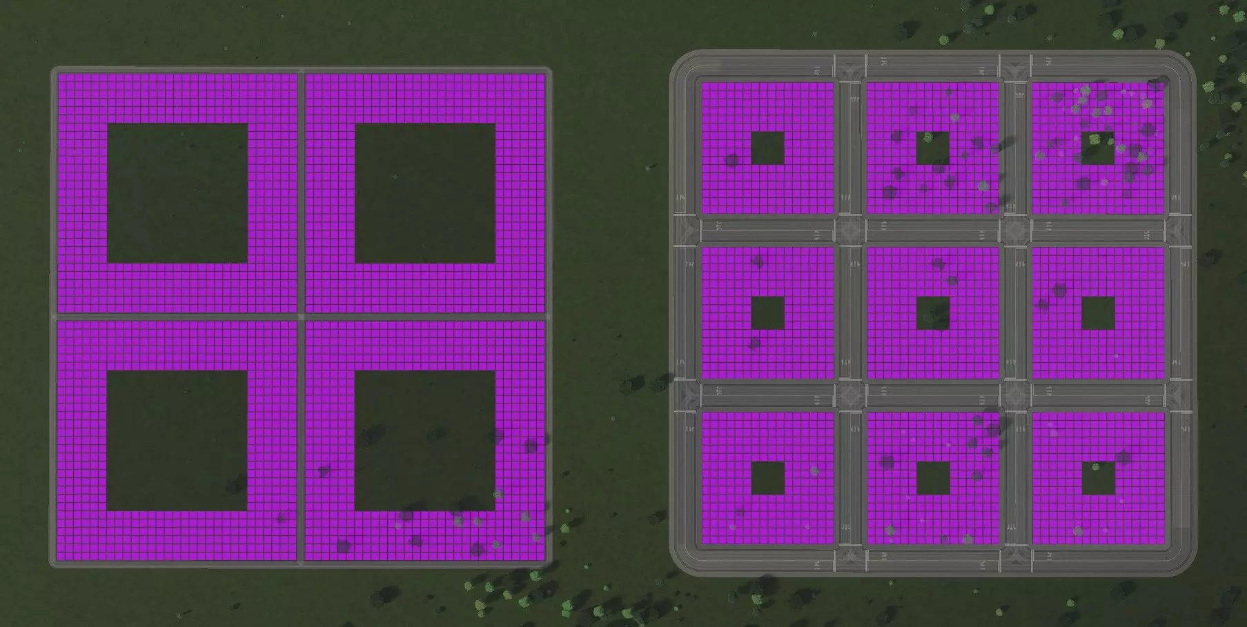 左边的方案看起来显然是首选。它在道路之间留出了整整12个分区单元格的宽度,这是在不留间隙的情况下能获得的最大宽度。这是使用道路工具绘制时最容易的长度之一,因为你只需对齐分区圆圈。它恰好也是平行道路模式下能获得的最宽宽度。 但如果你仔细计算(或者如果你读过我为《城市:天际线》原版写的指南,可能已经猜到了),右边的方案尽管每个街区中间有大洞,实际上却有更多的分区单元格。右边的方案建造和维护成本也更低,因为它的道路更少。 左边有12²×9²=11664个单元格;右边有(16²-4²)×7²=11760个单元格。 我们能做得更好吗?让我们来计算一下!(剧透:是的,我们可以。)最佳方形网格