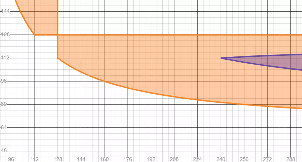 在图表中,你可以看到两个橙色区域在角落处相接的128×128米的最佳正方形区域。由于图表是对称的,我将顶部部分裁掉,因为它是多余的。橙色区域的西南边界由方程(x-64)(y-64)=3×32²确定,但不包括任何一边不大于128米的情况。 简单的结论是,112-128米乘以128米或更长的任何尺寸,效果至少与最佳正方形网格相当。而112×240米是(带有小路时)能达到80%密度的最小尺寸。 有趣的是,由于更深层次的分区网格,与《城市:天际线》相比,这里有了更多的自由度。如果网格的一边至少为128米(我们称之为a),那么从64×(a-16)÷(a-64)米到128米的任何尺寸,效果也至少与正方形网格相当。例如96×160米(即10×18个可分区单元格)与方形网格效果相当,80×256米(即8×30个可分区单元格)也是如此。尤其是后者可能过于紧凑,在交叉路口之间留出更多空间可能会更好,但如果你喜欢那种外观,这仍然可行。 那么,如果我们转而寻找具有特定宽高比≥1的最佳矩形网格呢?这样一来,ISO纸张爱好者可以使用√2,斐波那契爱好者可以使用φ,纽约风格爱好者可以使用3或更大的比例。 我们知道对于正方形(宽高比=1),我们应该得到128米的尺寸。但我们也知道,当宽高比趋近于无穷大时,我们应该得到112米的尺寸。我们该如何衔接这两种情况呢?经过一些计算得出公式:= 256/( + 1)。这次我把推导过程留给读者自行思考。作为基本的合理性检验,该公式给出了之前计算的正方形情况下的答案,因此看起来是合理的。但当→∞时,→0,所以这不可能是完整答案。 问题出在哪里呢?关键在于要注意得出该答案的公式是基于一个假设:≥≥112。 这意味着该公式仅在1≤≤⁹⁄₇时成立,这确实有很大的局限性。进一步将其限制为仅考虑8米倍数的区块大小(即“对齐分区单元格长度”),则只剩下: =1,区块大小为128×128米 =¹⁷⁄₁₅≈1.1333,区块大小为120×136米 =⁹⁄₇≈1.2857,区块大小为112×144米。最后这个结果与我们预期的大型区域112的答案一致,因此我们找到了一个连续(尽管只是分段可微)的答案。 或许这提供了一种合理的矩形选择方式:当使用小型道路时,112×144米是最优网格无空洞情况下最接近正方形的宽高比。其密度为16/21≈76.2%,略高于128×128米的75%密度。 正多边形 六边形是最佳图形。原因众多,其中蜂窝猜想证明了在将平面细分为等面积区域时,六边形的周长最小。不过这并非我们在此处真正尝试要做的——我们的道路并非无限狭窄,我们关注的也不完全是区域范围——但两者已经足够接近,所以我们确实应该尝试一下。